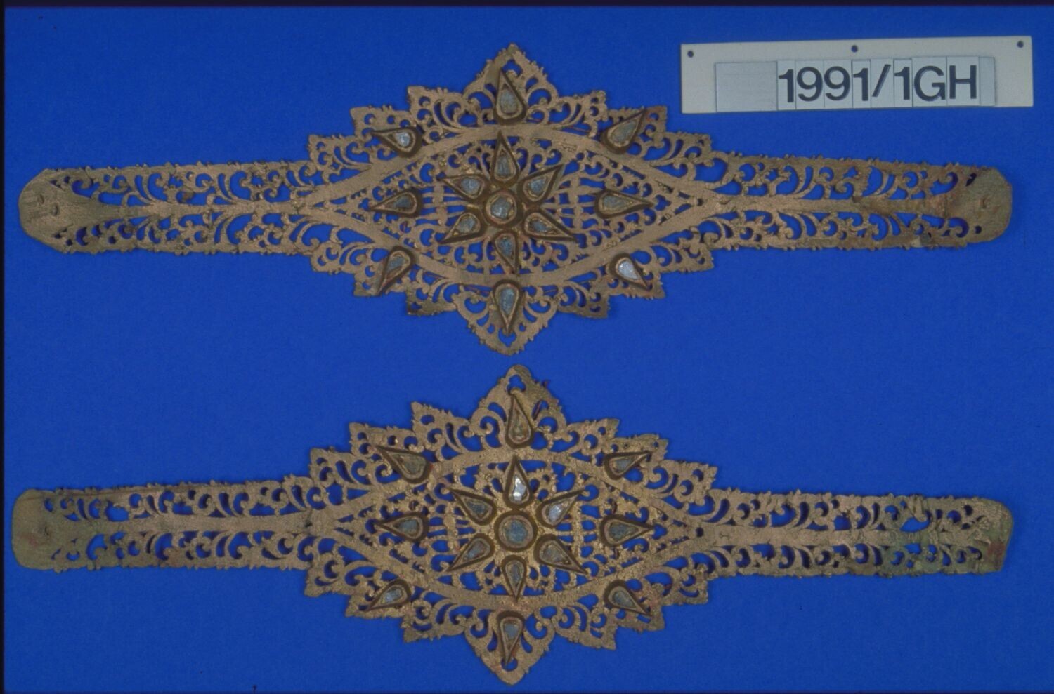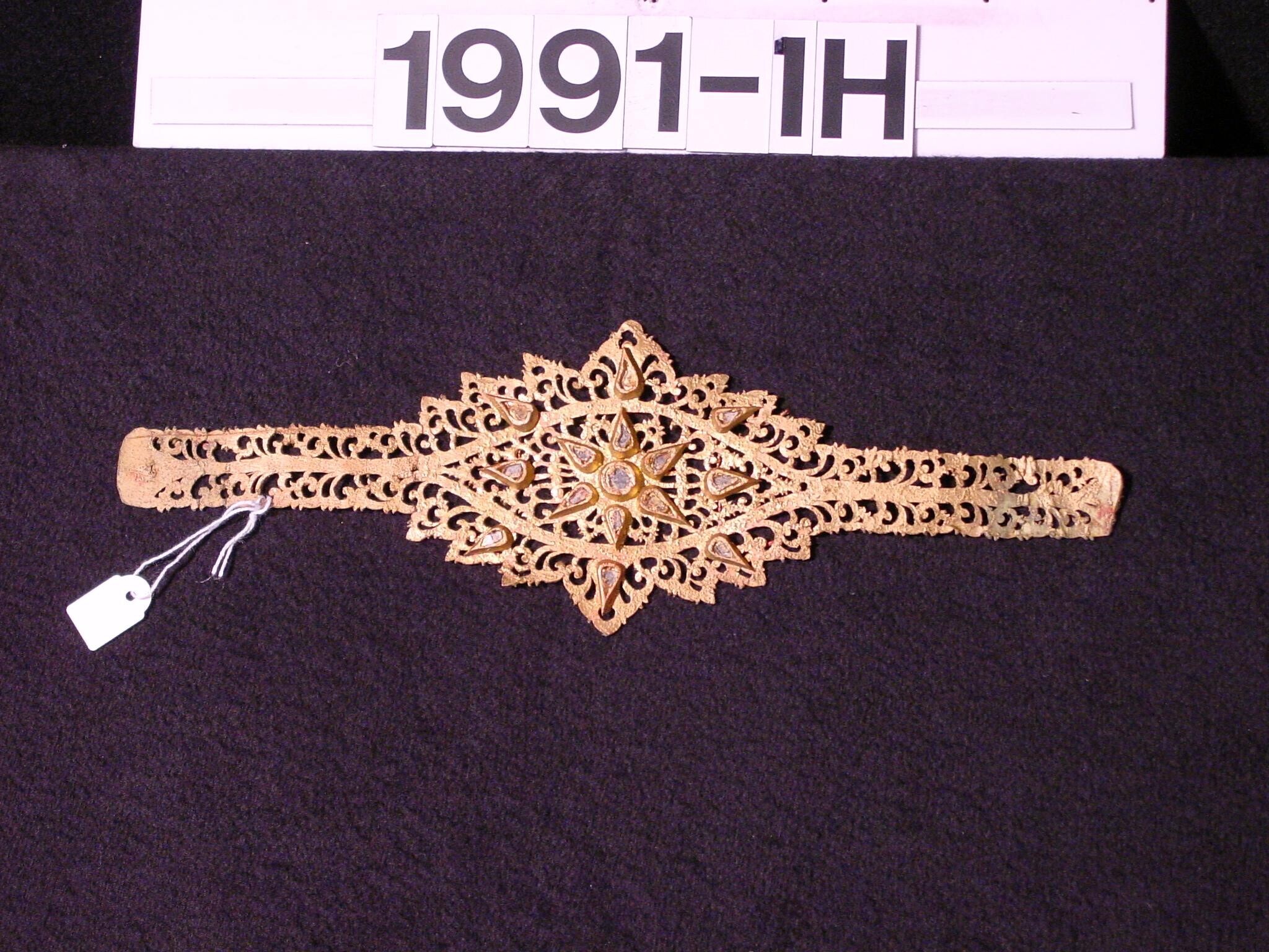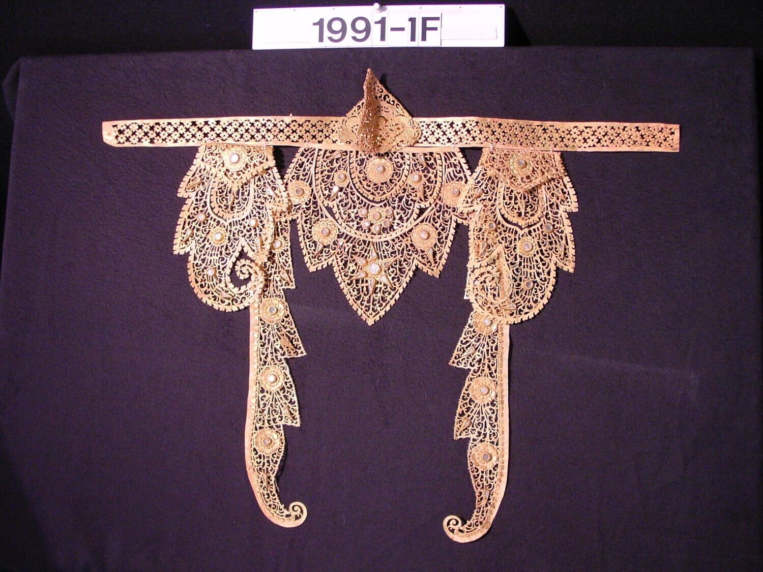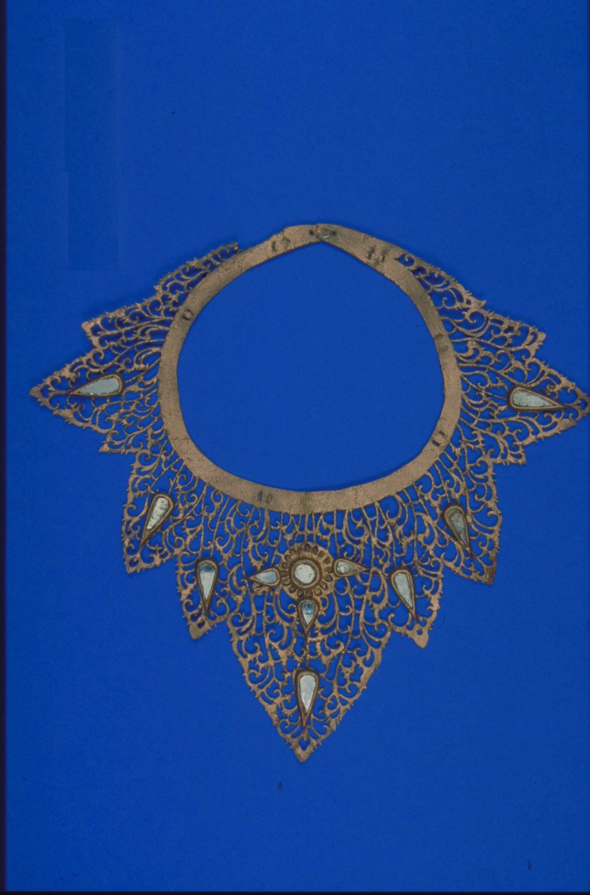 Halssieraad van verguld leer, behorend bij danskostuum