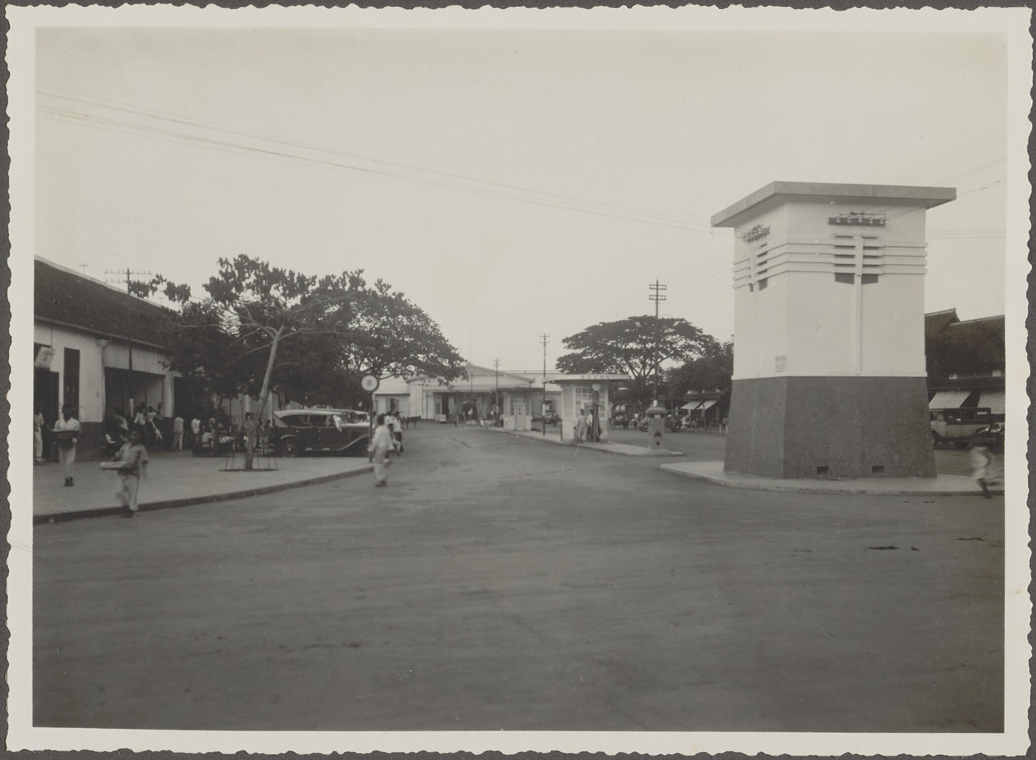 Gezicht op de nieuwe en herstelde pasarloodsen te Br...