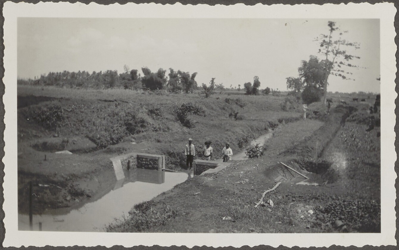Twee Javaanse arbeiders werken aan een waterbouwkund...