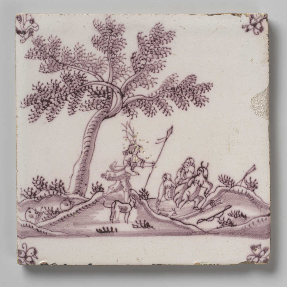 tegel van aardewerk met tinglazuur, voorstellende: A...