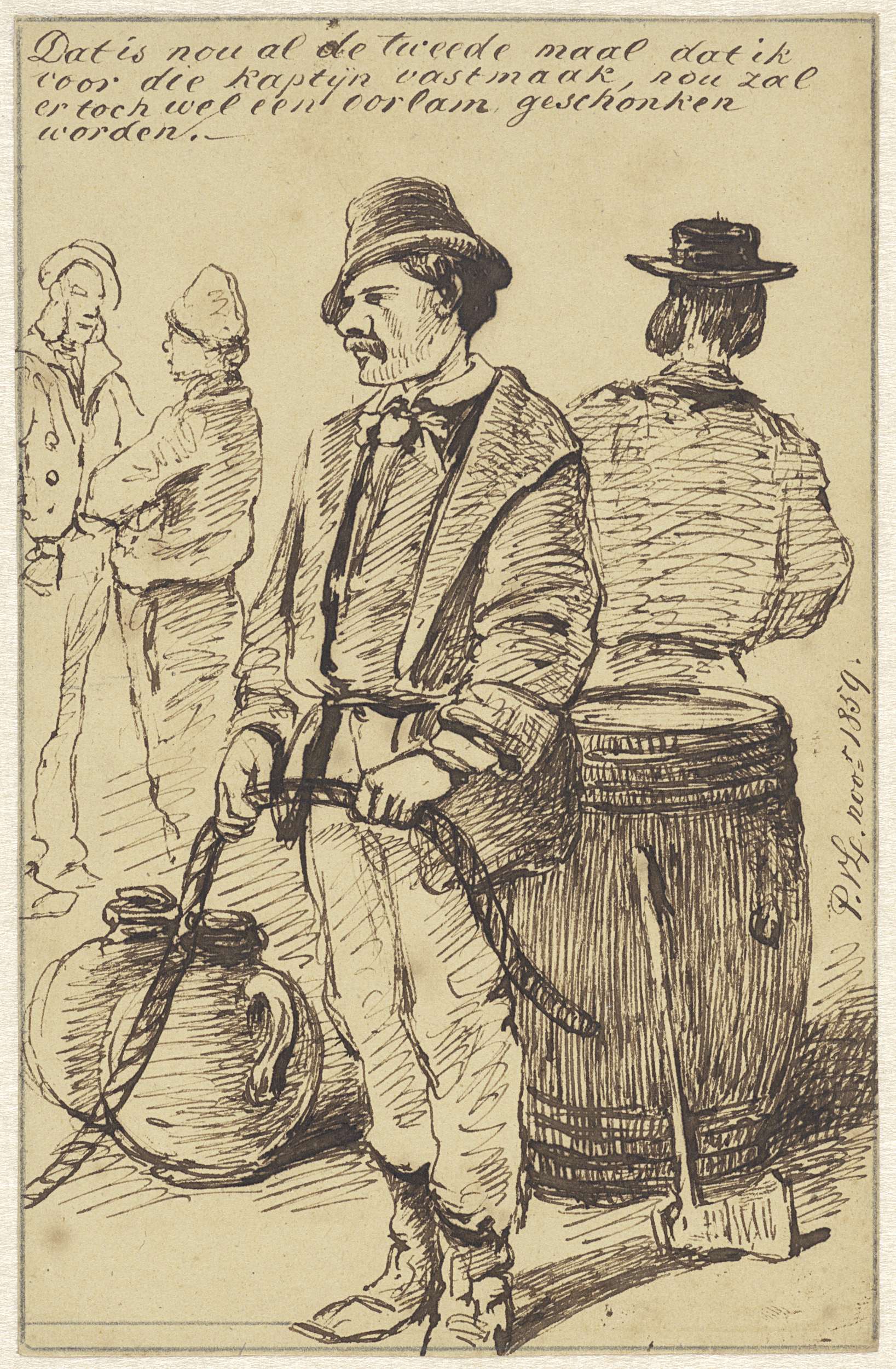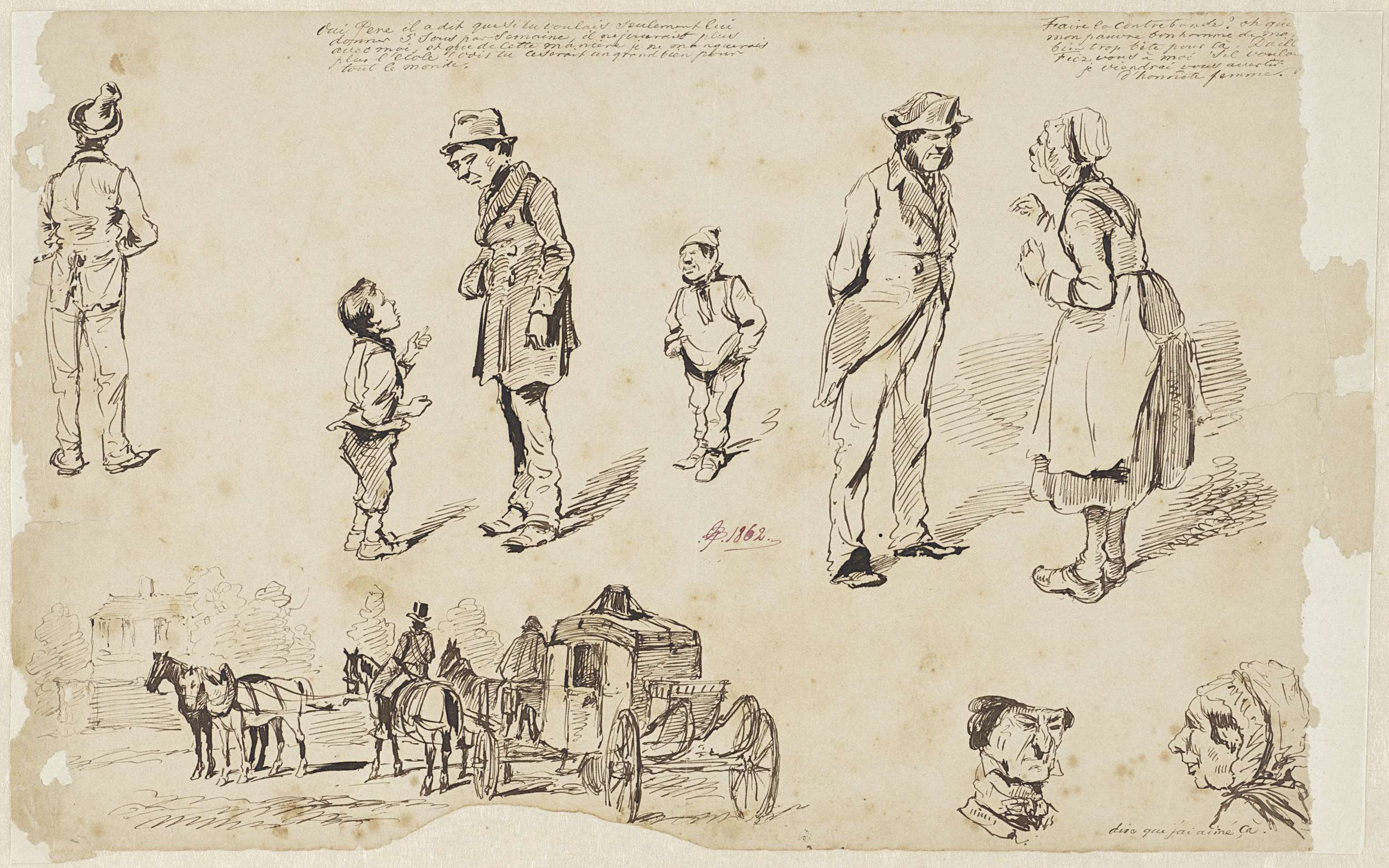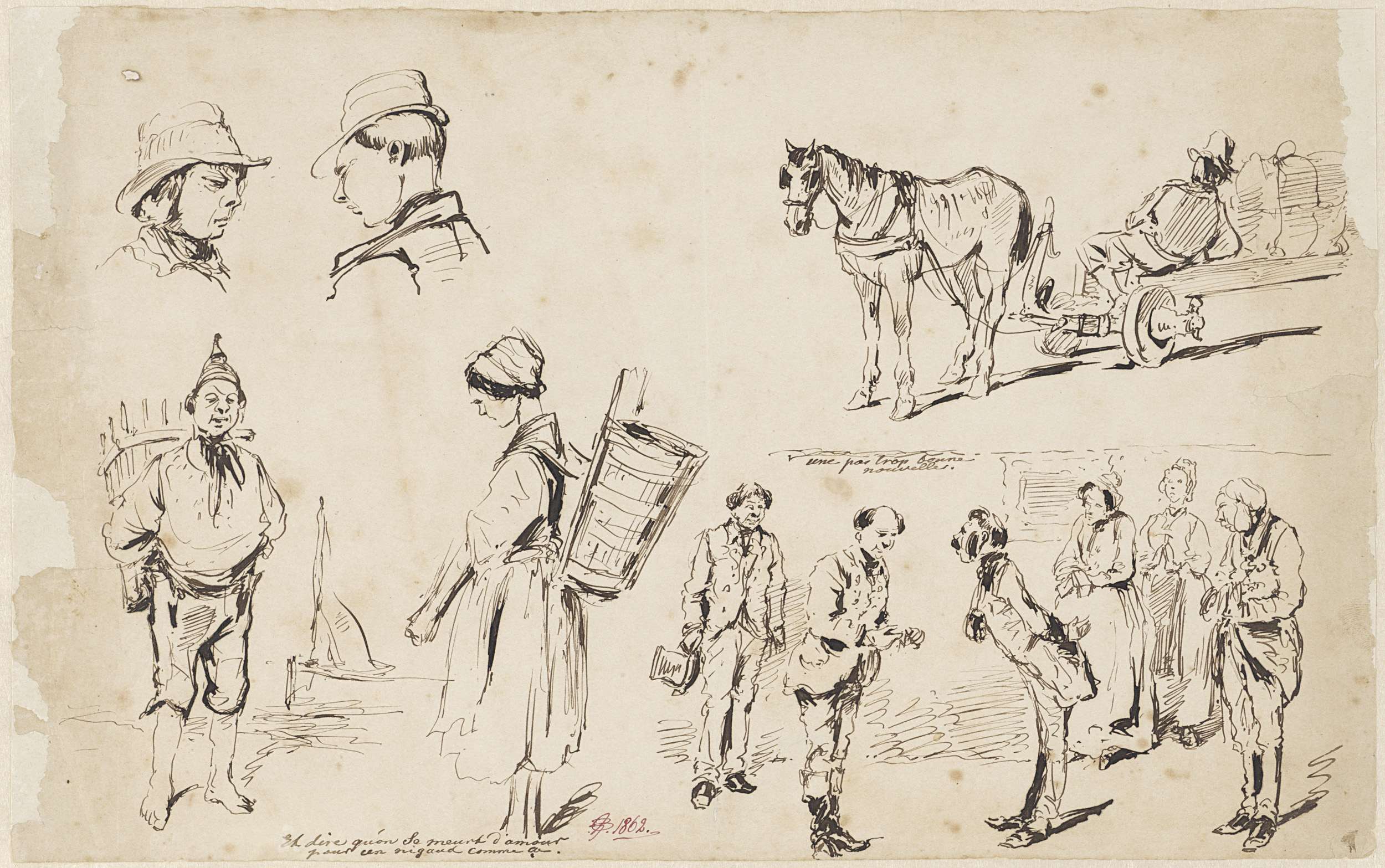 Karikaturale figuurscènes en een paard en wagen
