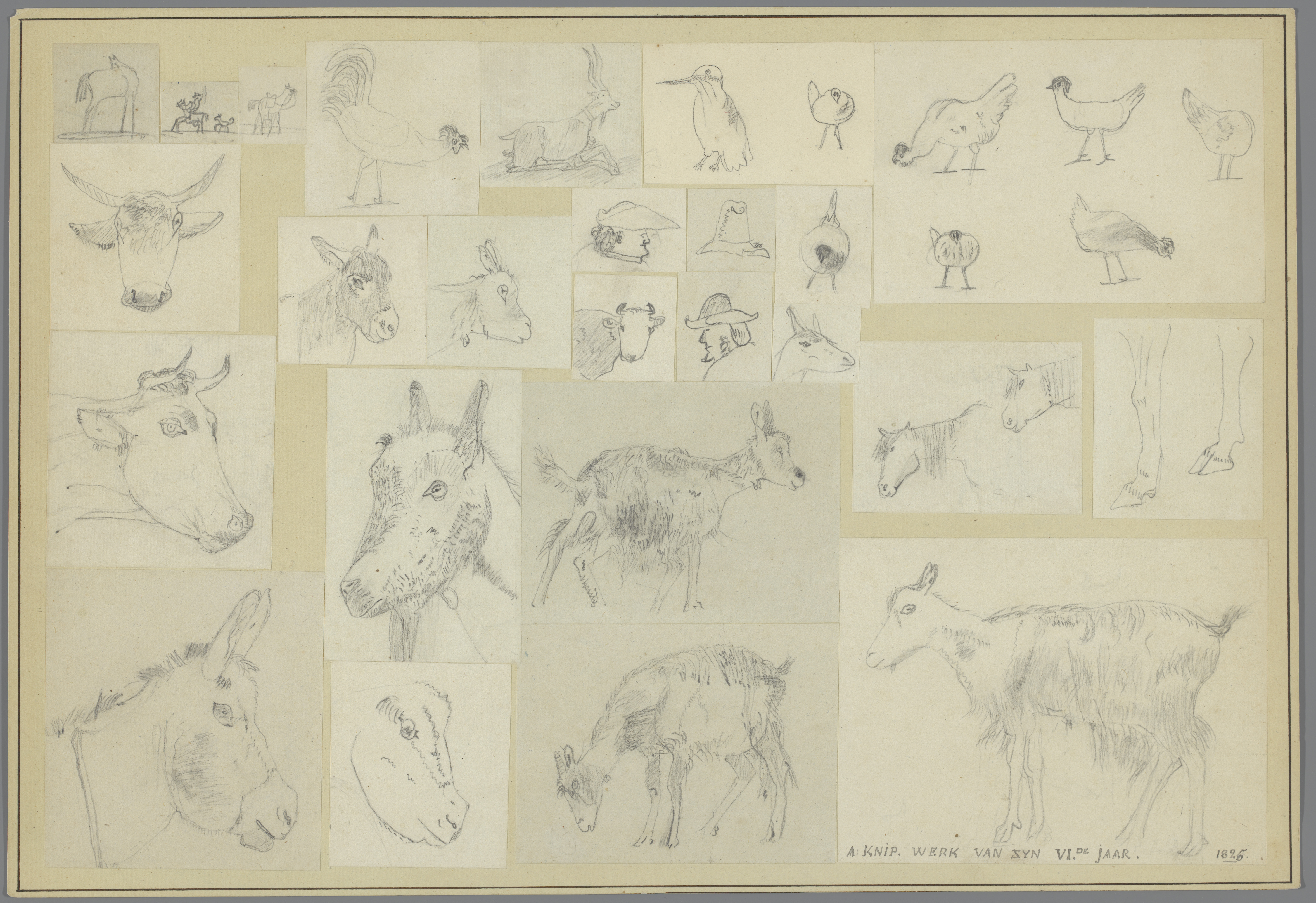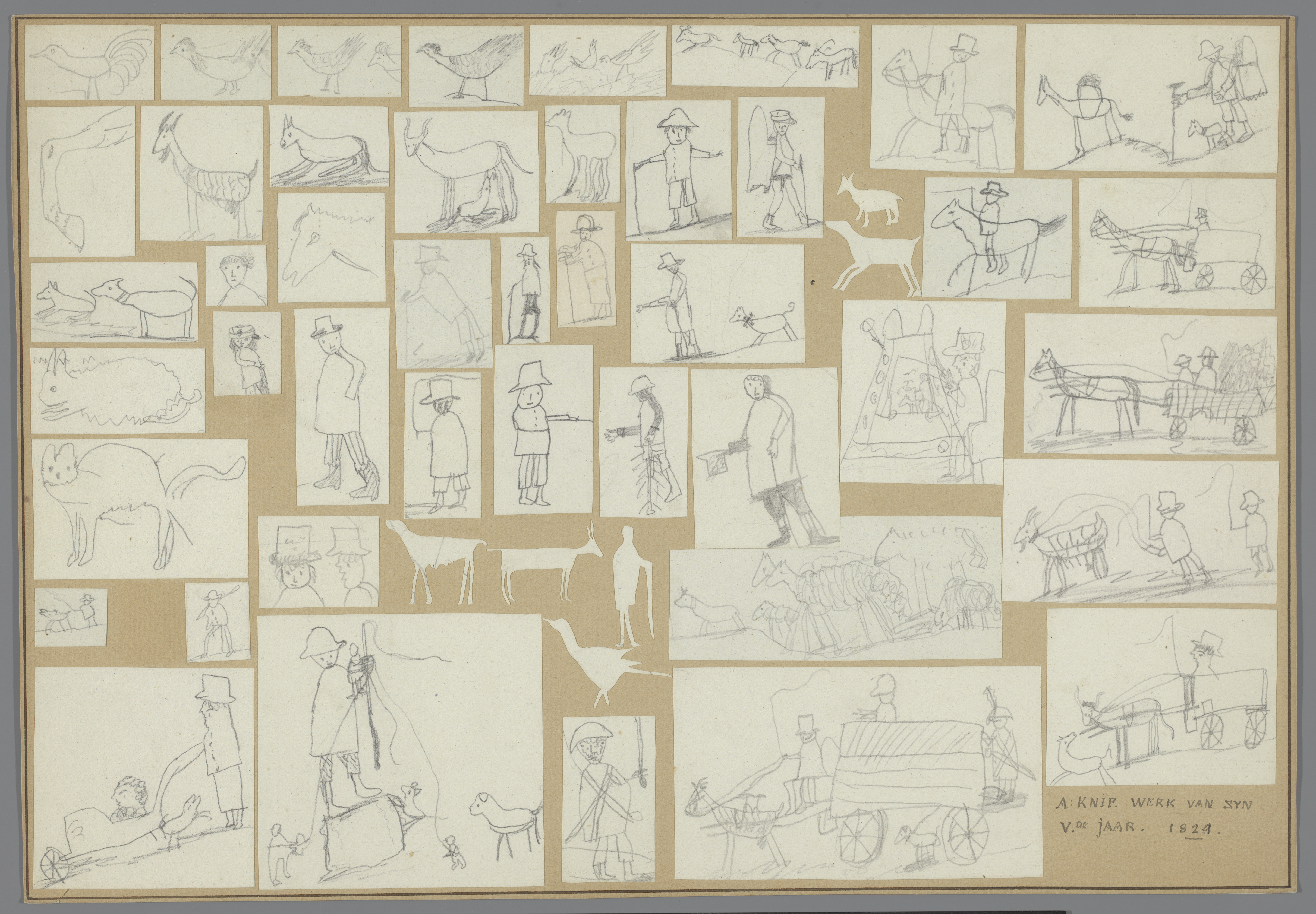 Karton waarop 25 kindertekeningen van dieren en mens...