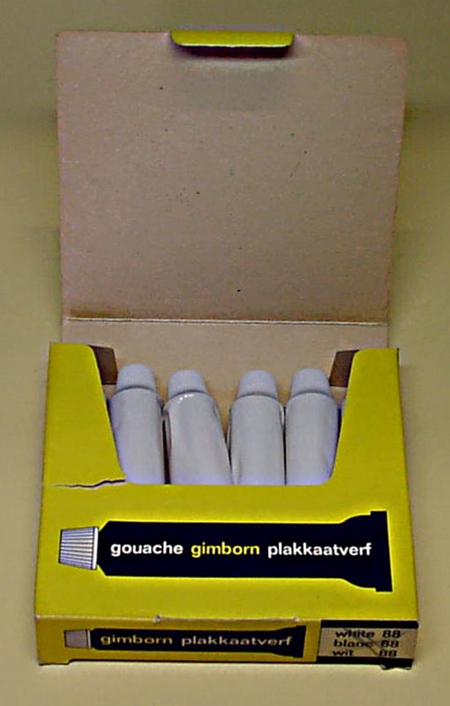 Doos van karton met tubes plakkaatverf door H. van G...