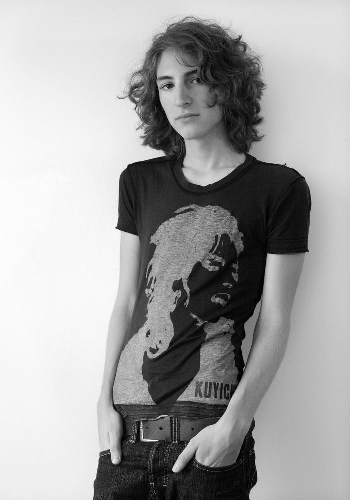 Portret in zwartwit van langharige jongeman met t-sh...