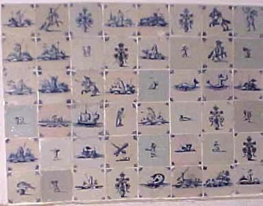 Tegelveld. Achtenveertig tegels op blauw witte achte...
