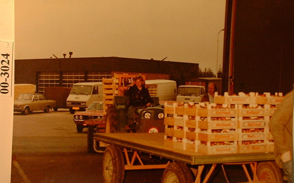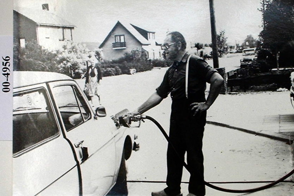 Piet Schut aan het benzine tanken bij zijn bedrijf a...