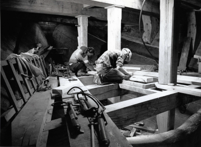 Scheepsbouwers aan het werk op de Bataviawerf