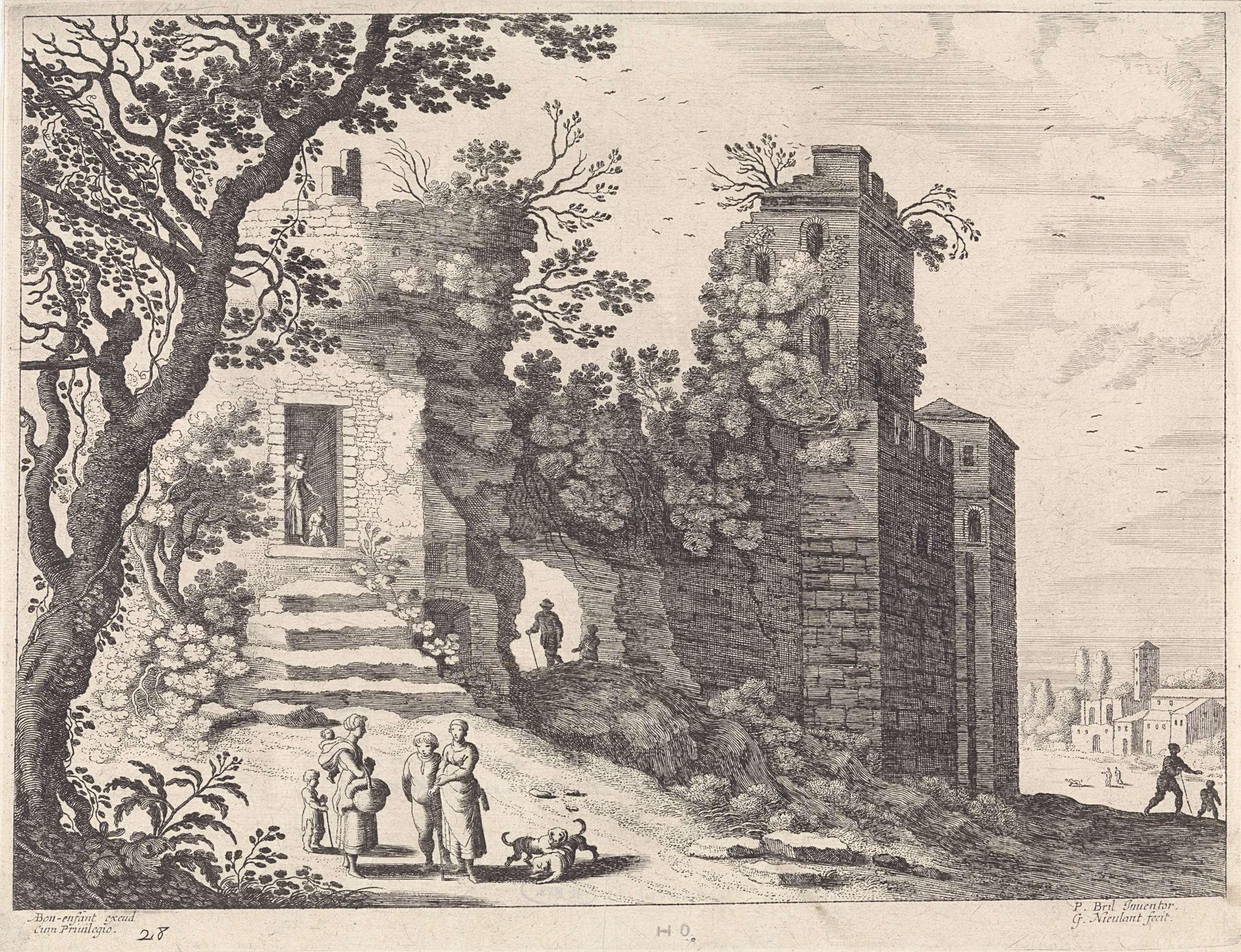 Ruïne met een groep vrouwen en kinderen