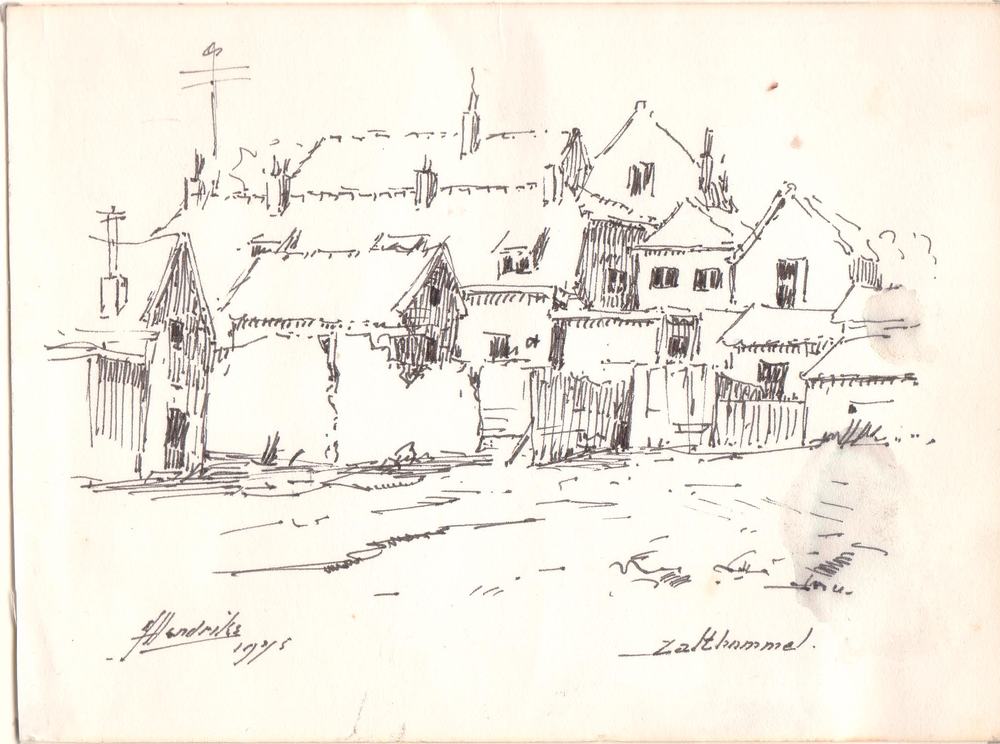 gezicht op huizen binnenstad Zaltbommel. tekening J....
