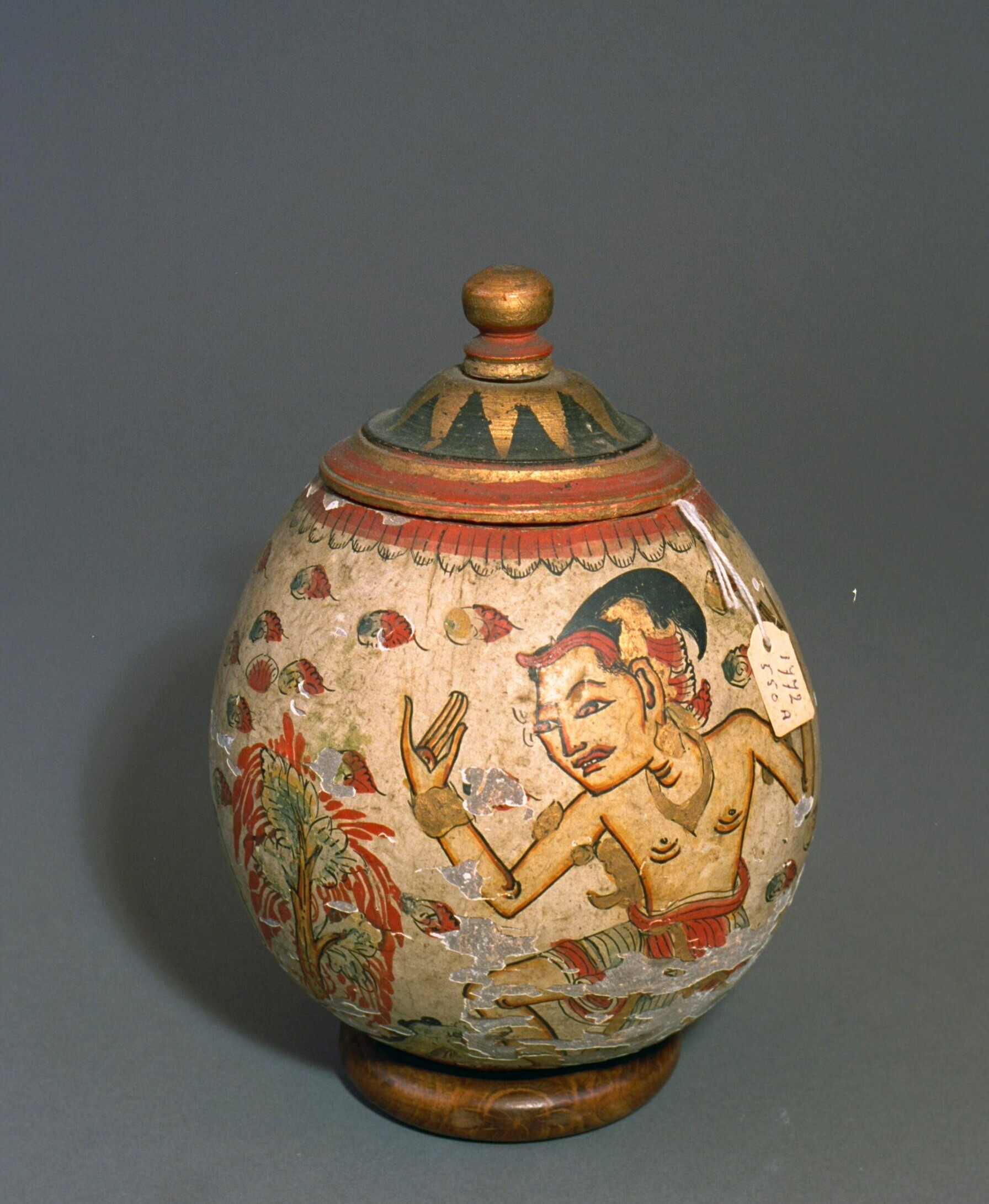 Watervat van een kokosnoot met deksel, beschilderd m...