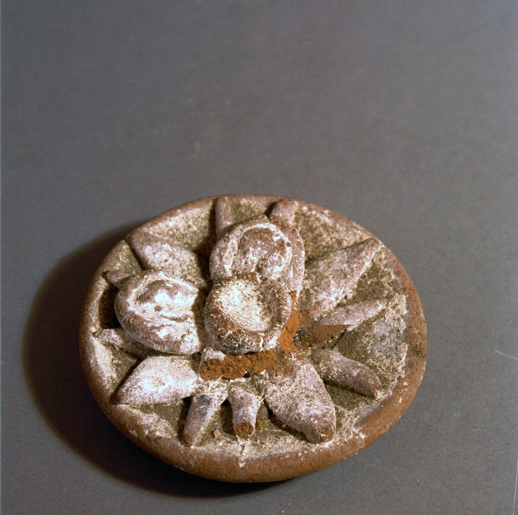 Beschilderd stuk houtsnijwerk in de vorm van een ron...