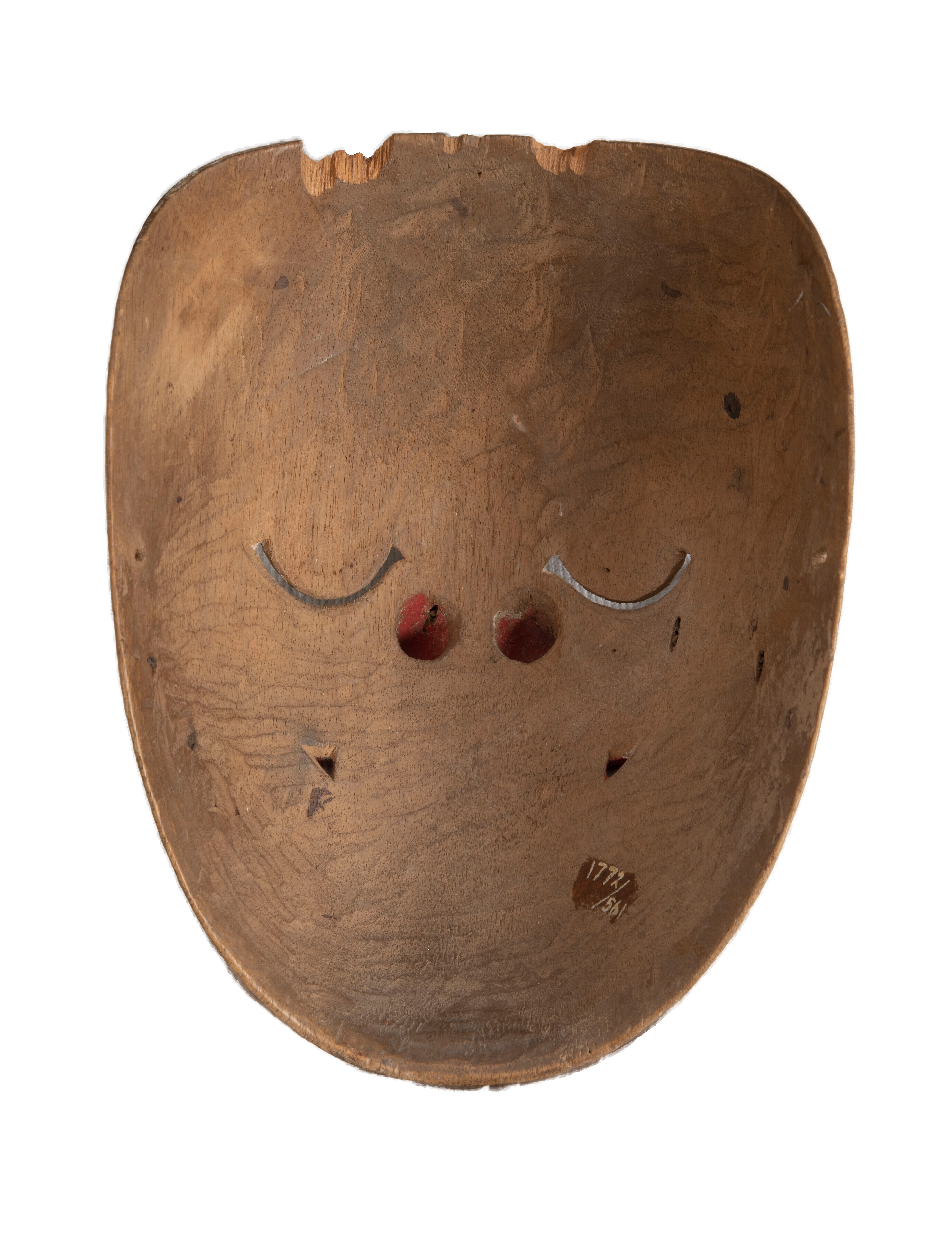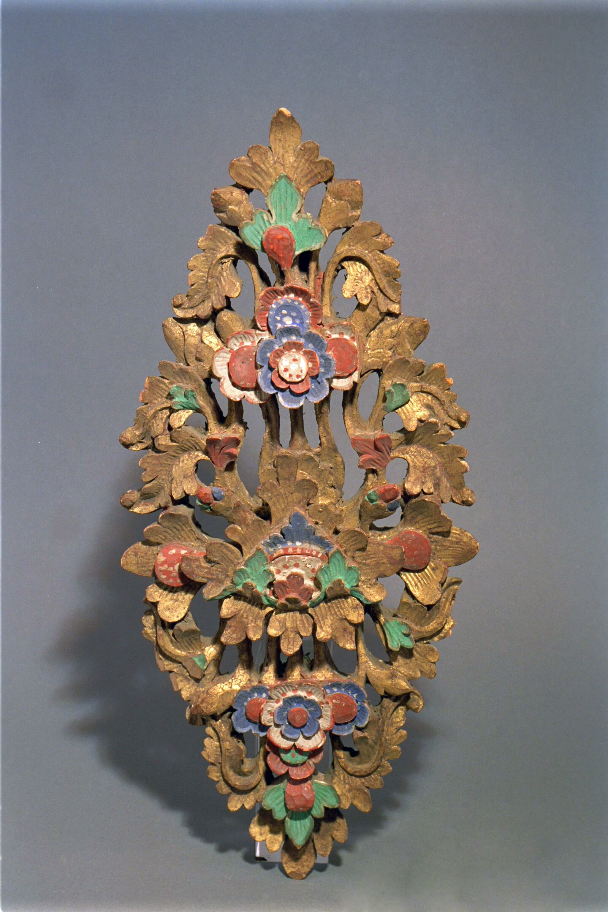Bladvormig, veelkleurig beschilderd stuk houtsnijwerk