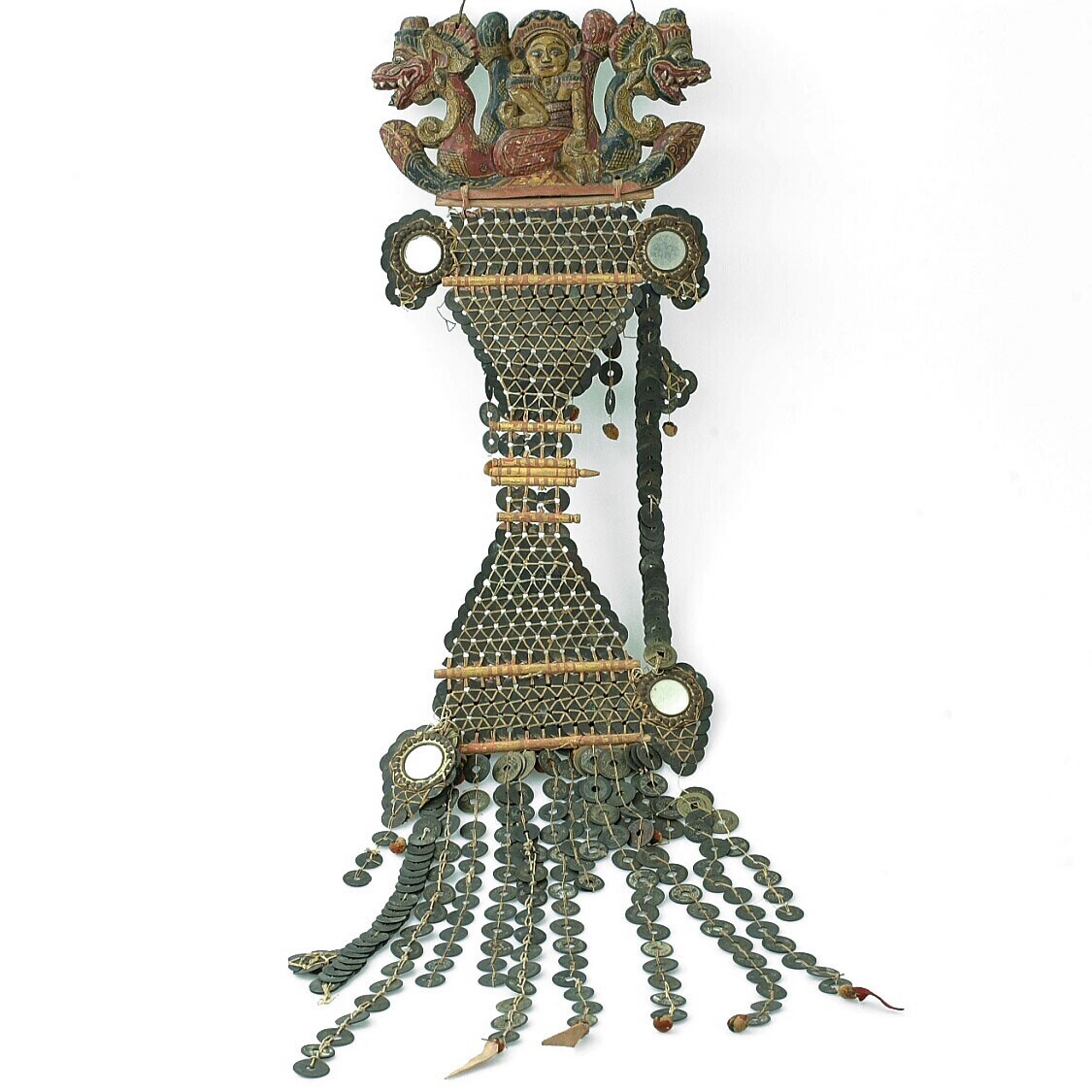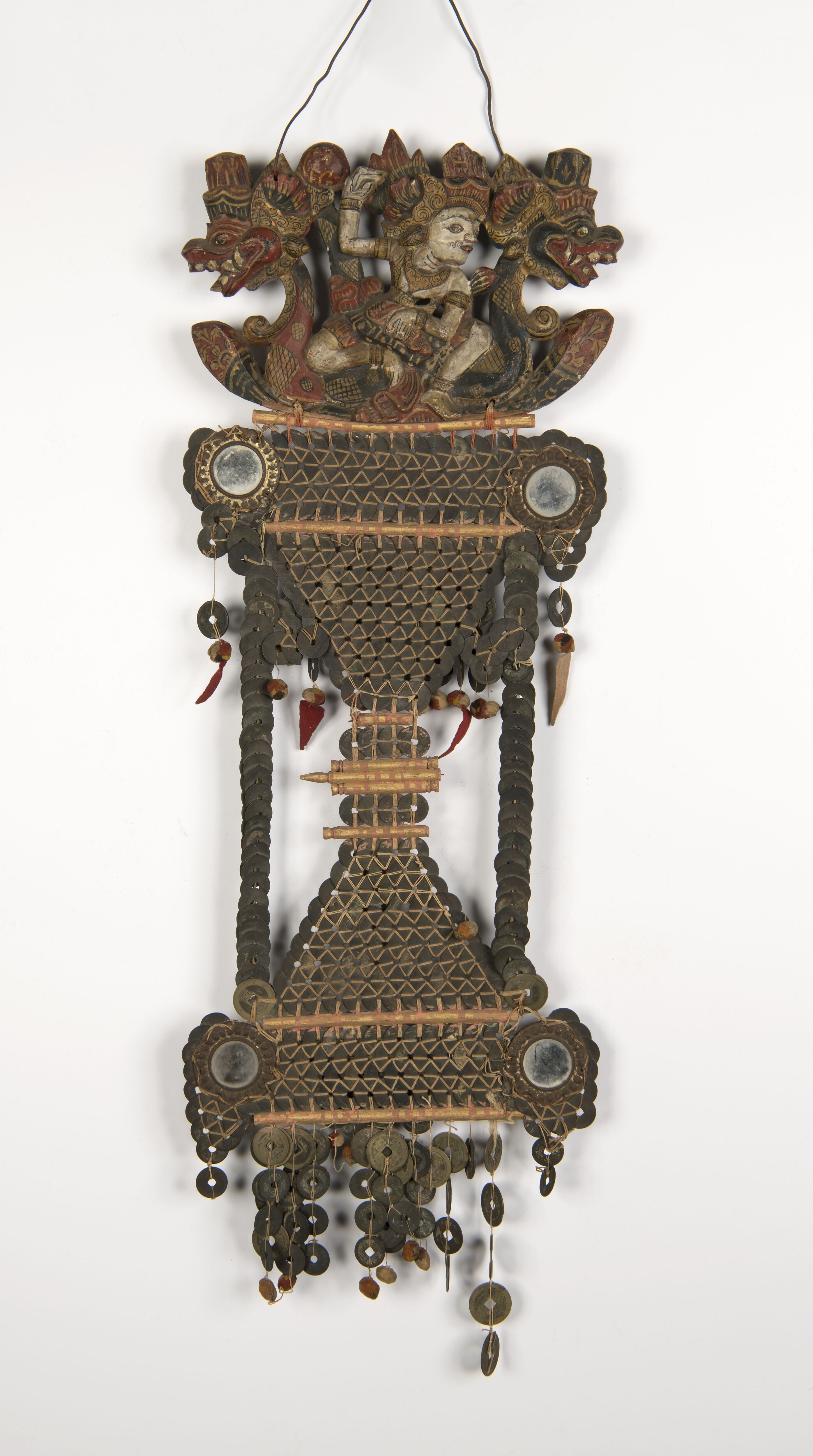 Tempelhanger van houtsnijwerk, waaraan strengen van ...