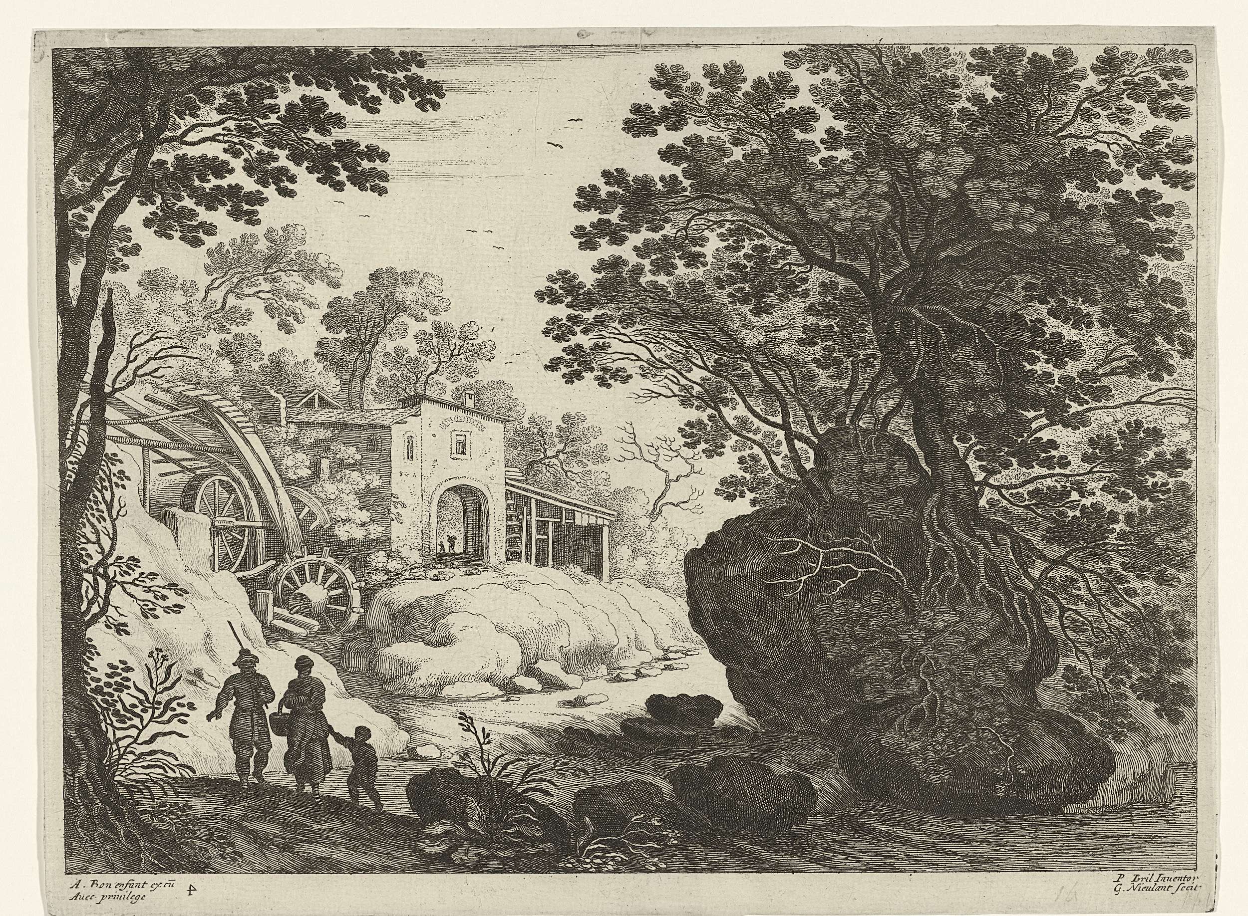 Paar en kind bij watermolen