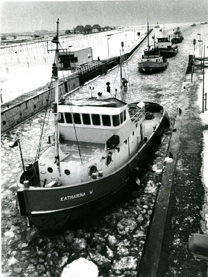 Schepen varen door een sluis met bevroren water