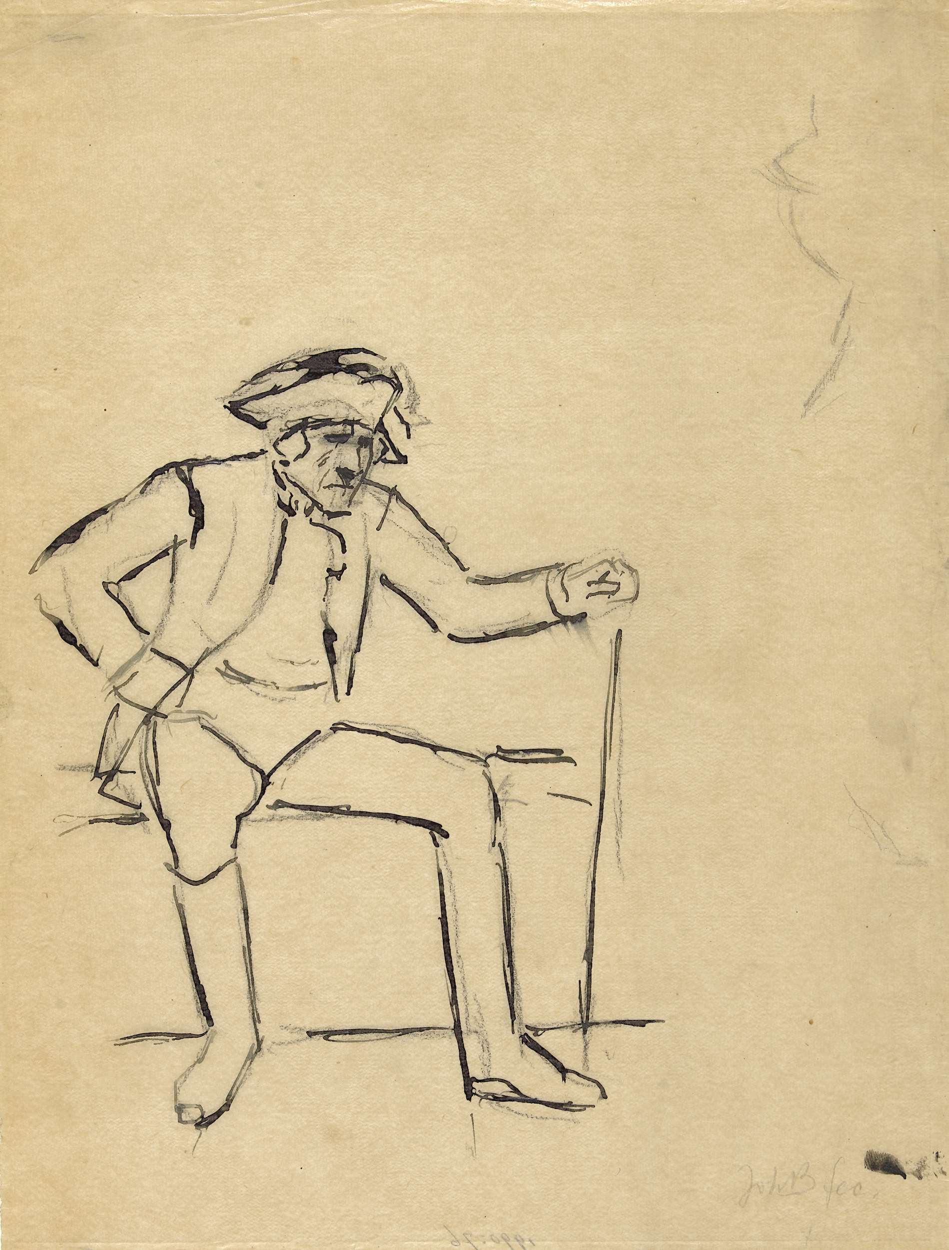 Zittende oude man met steek en stok