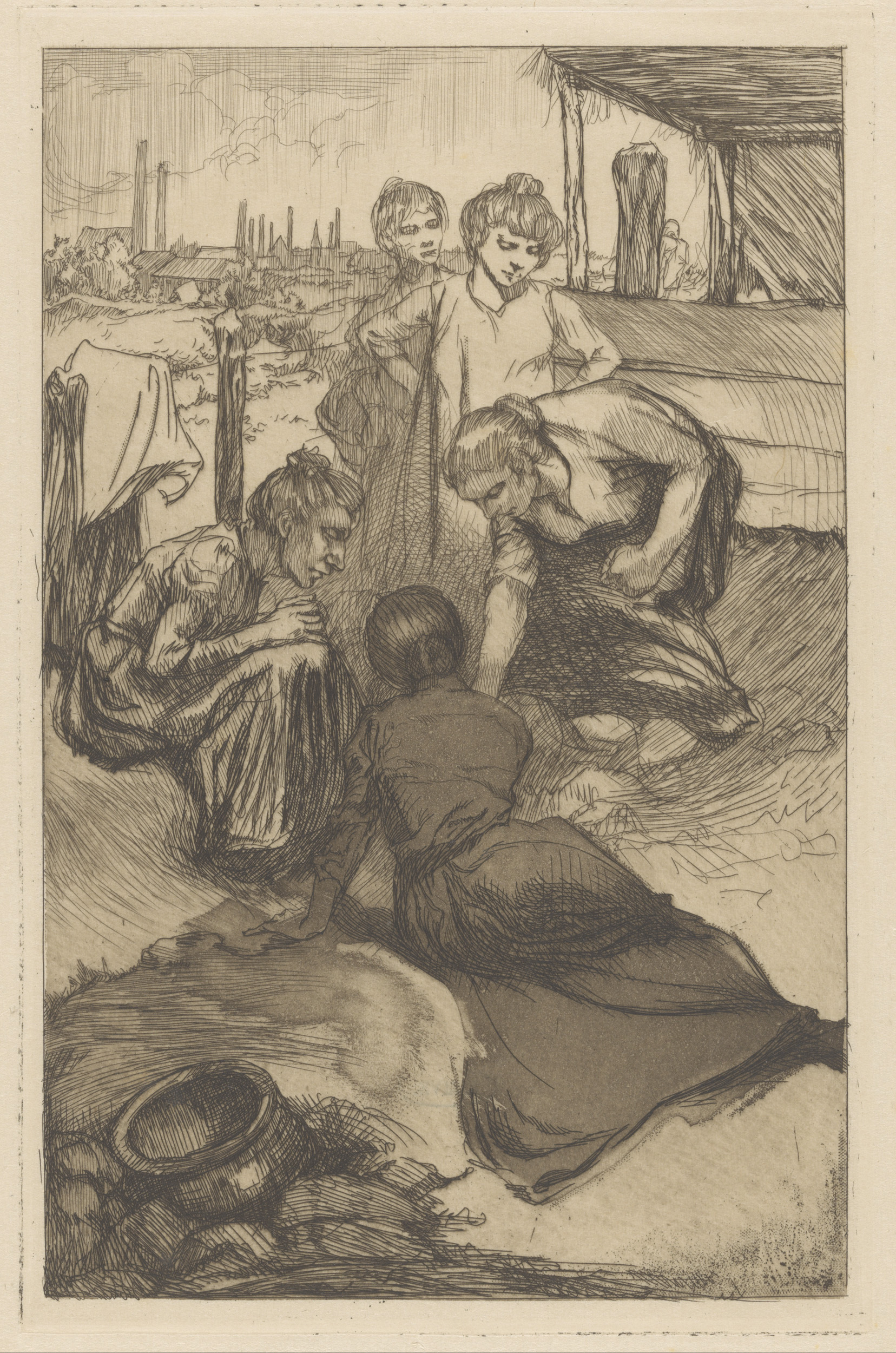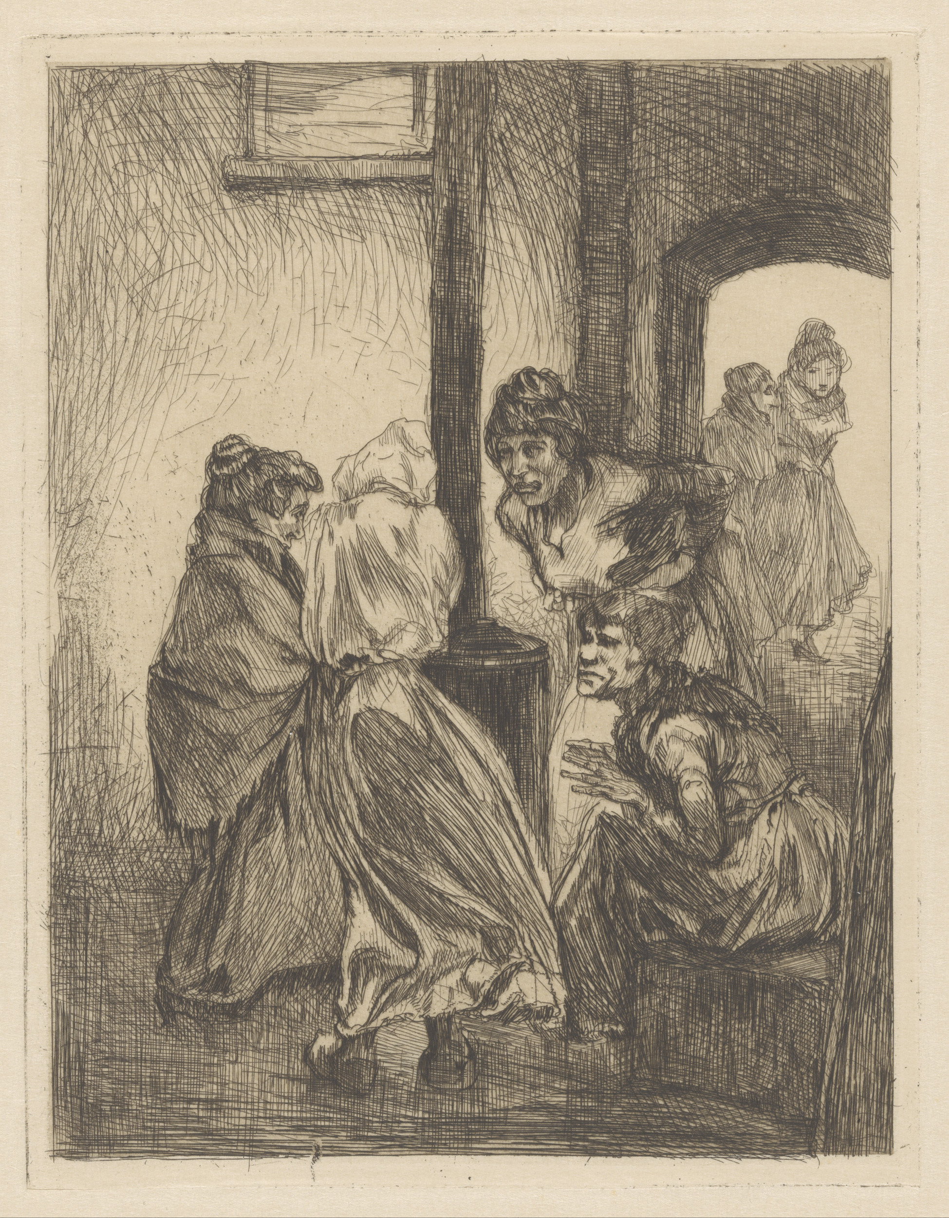 Staande en zittende vrouwen en meisjes