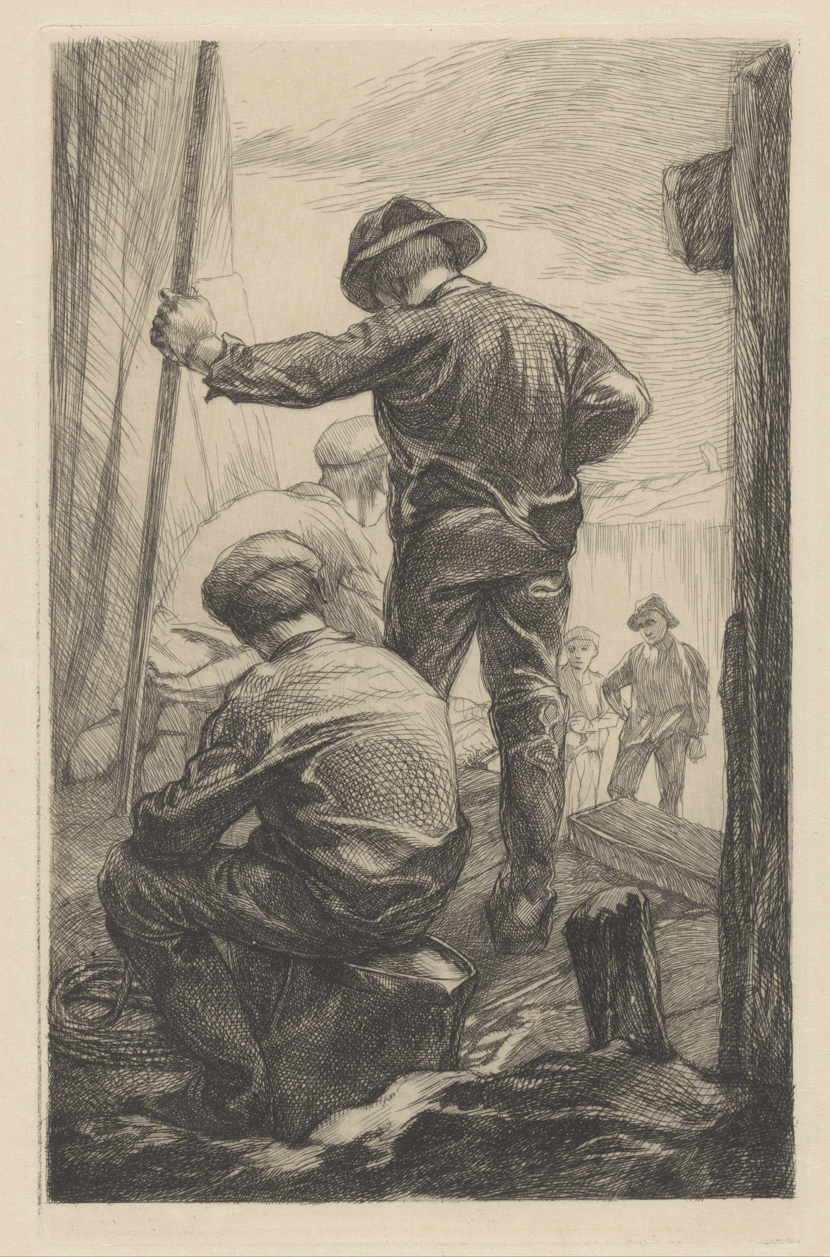 Drie arbeiders met pet