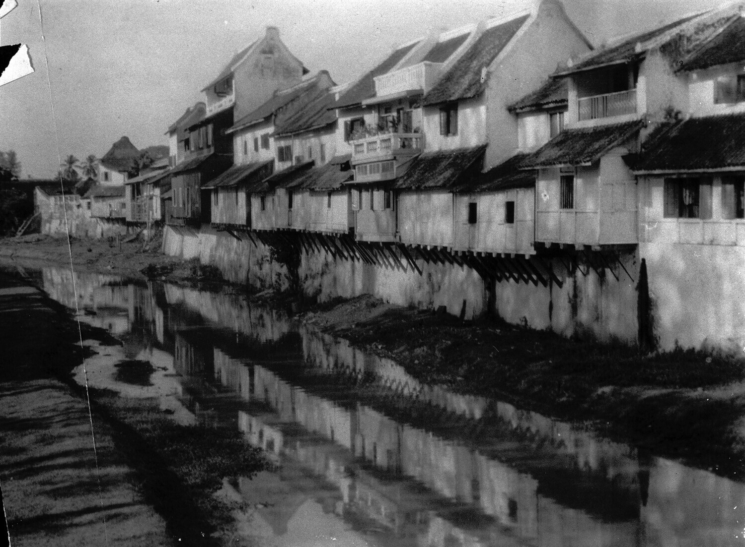 Huizen langs de Solorivier in Soerakarta, Java.