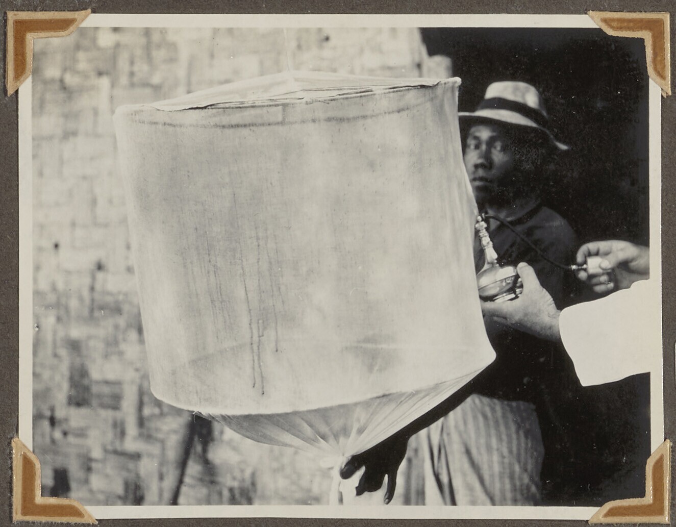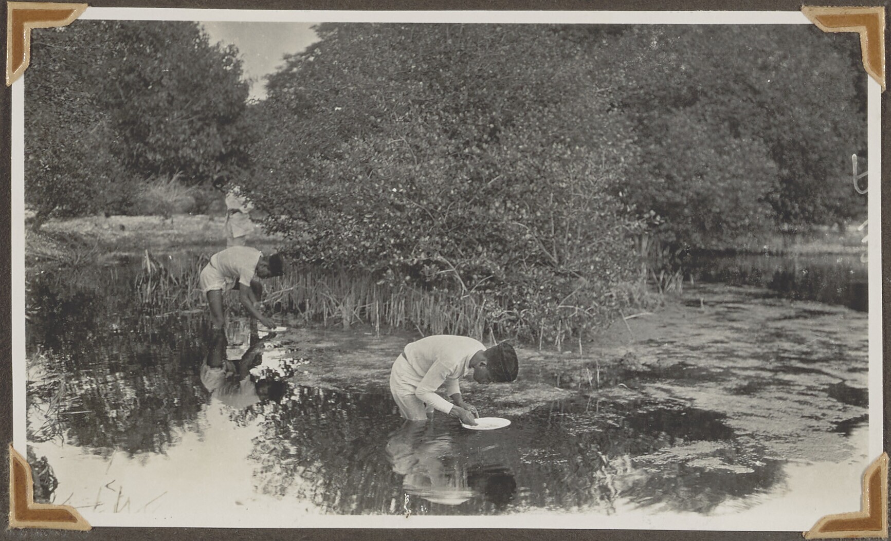 Bestrijding van malaria; twee mannen vangen larven i...