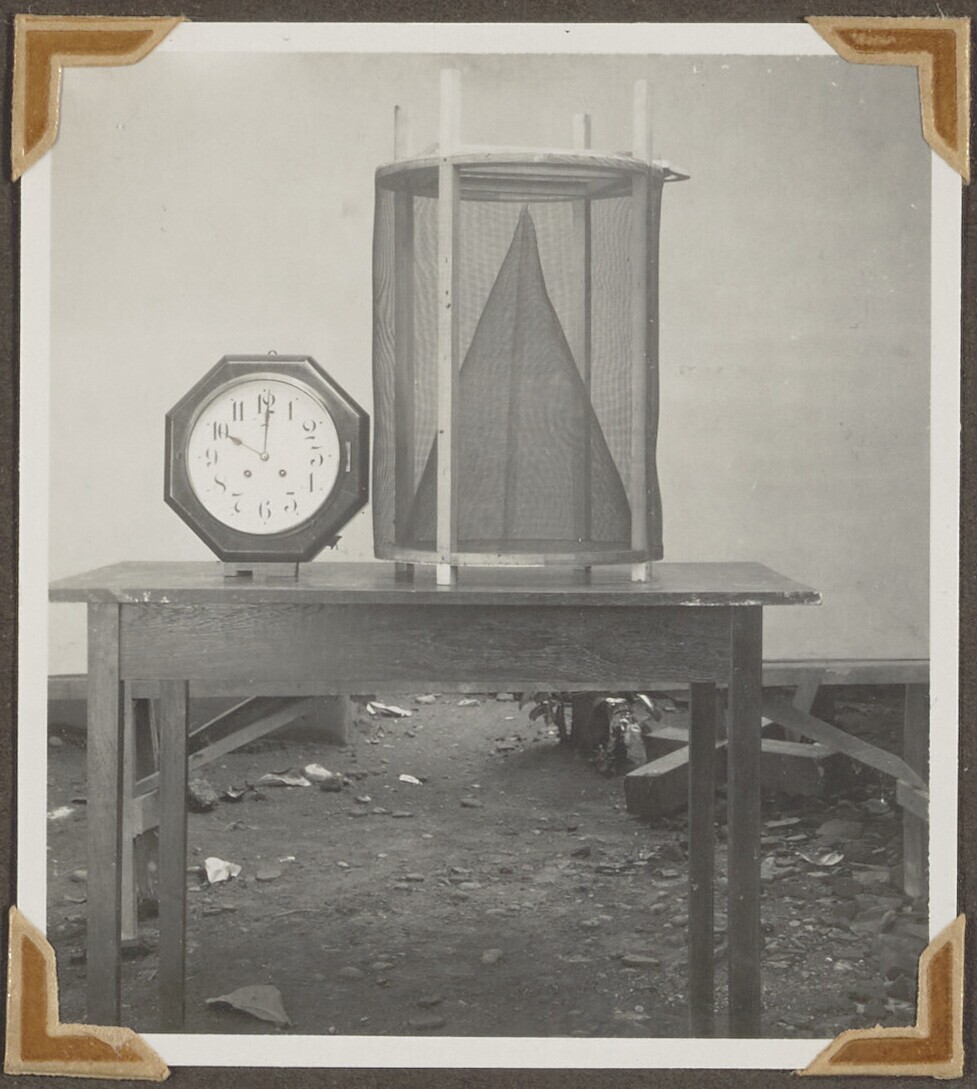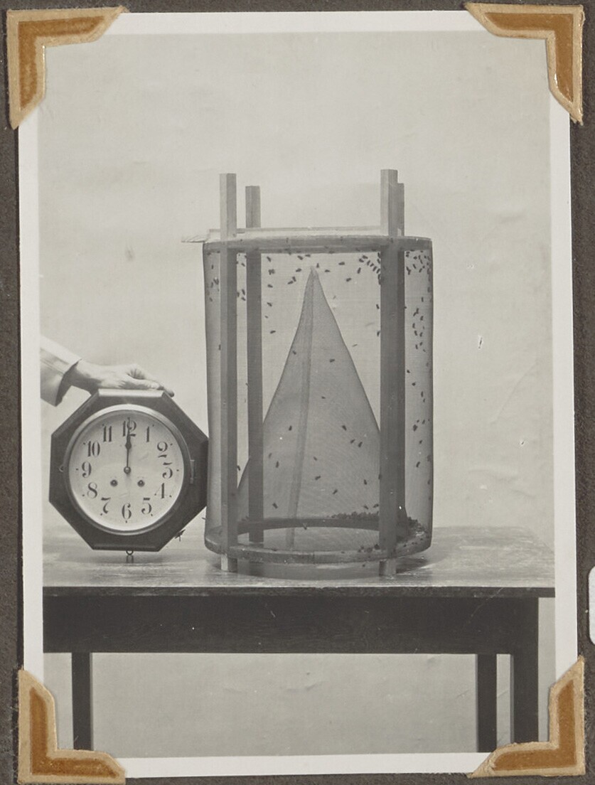 Een vliegenvanger met een klok; de klok staat op 10....