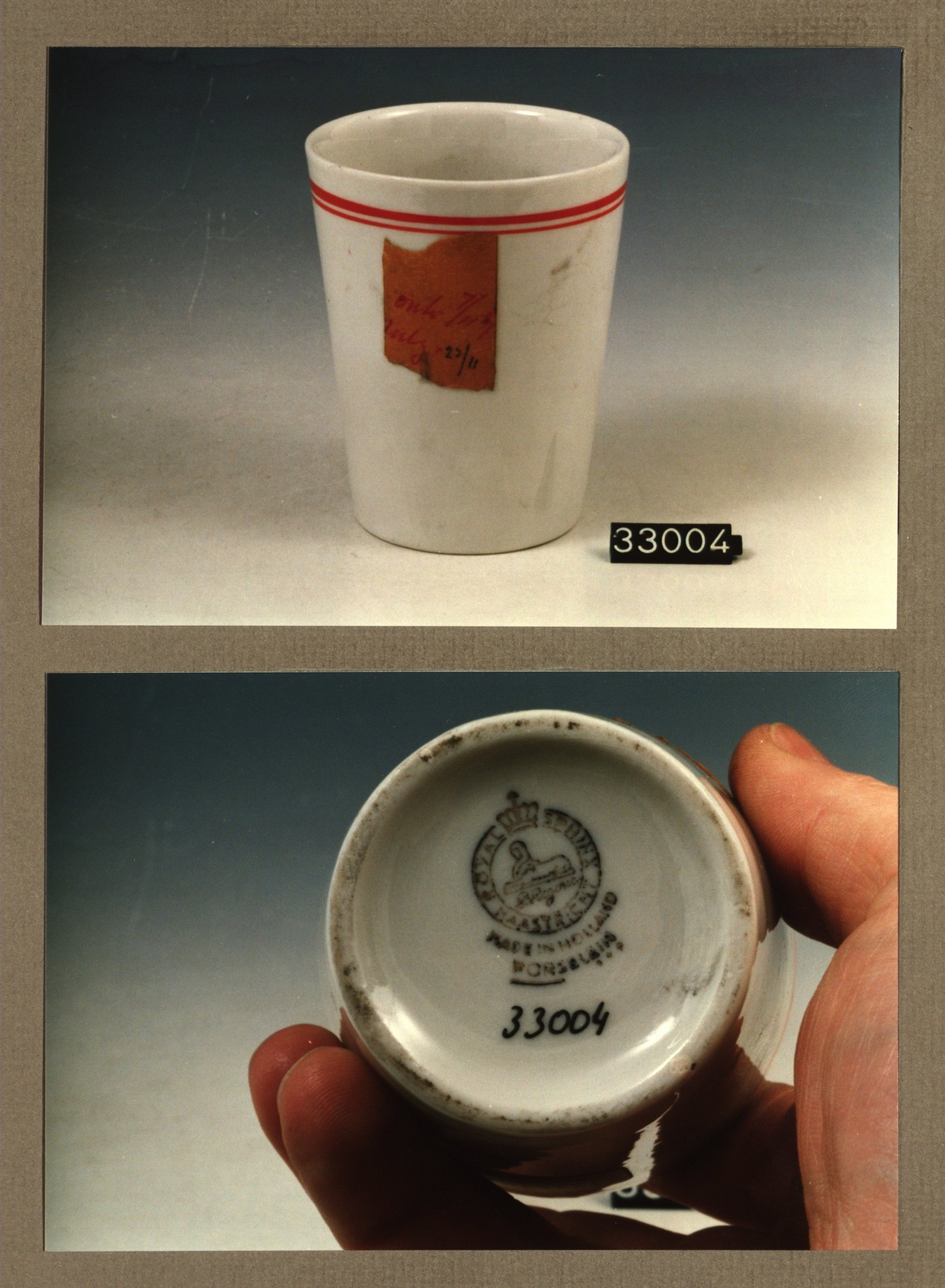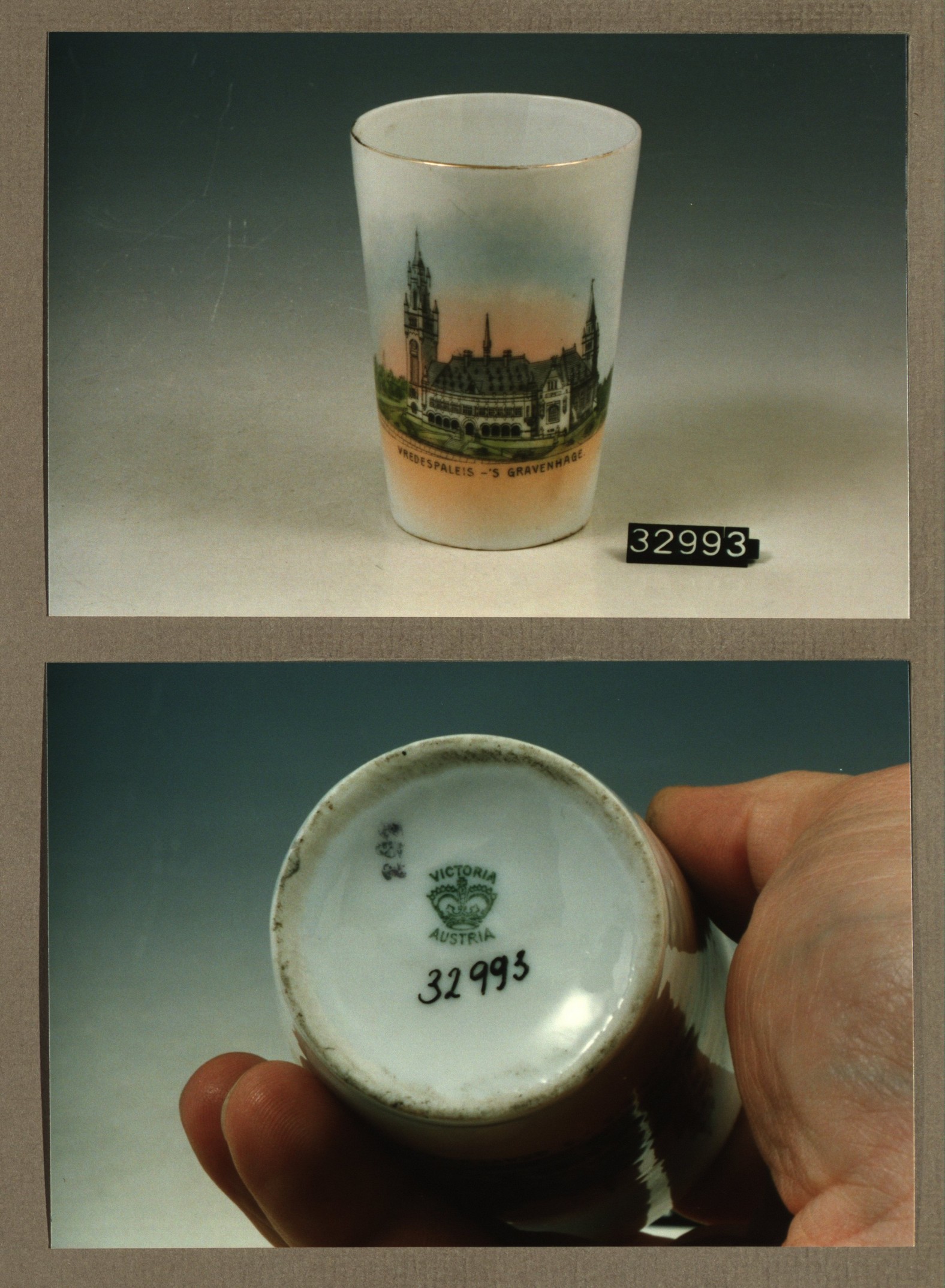 Beker met opschrift met decor Vredespaleis s'Gravenhage