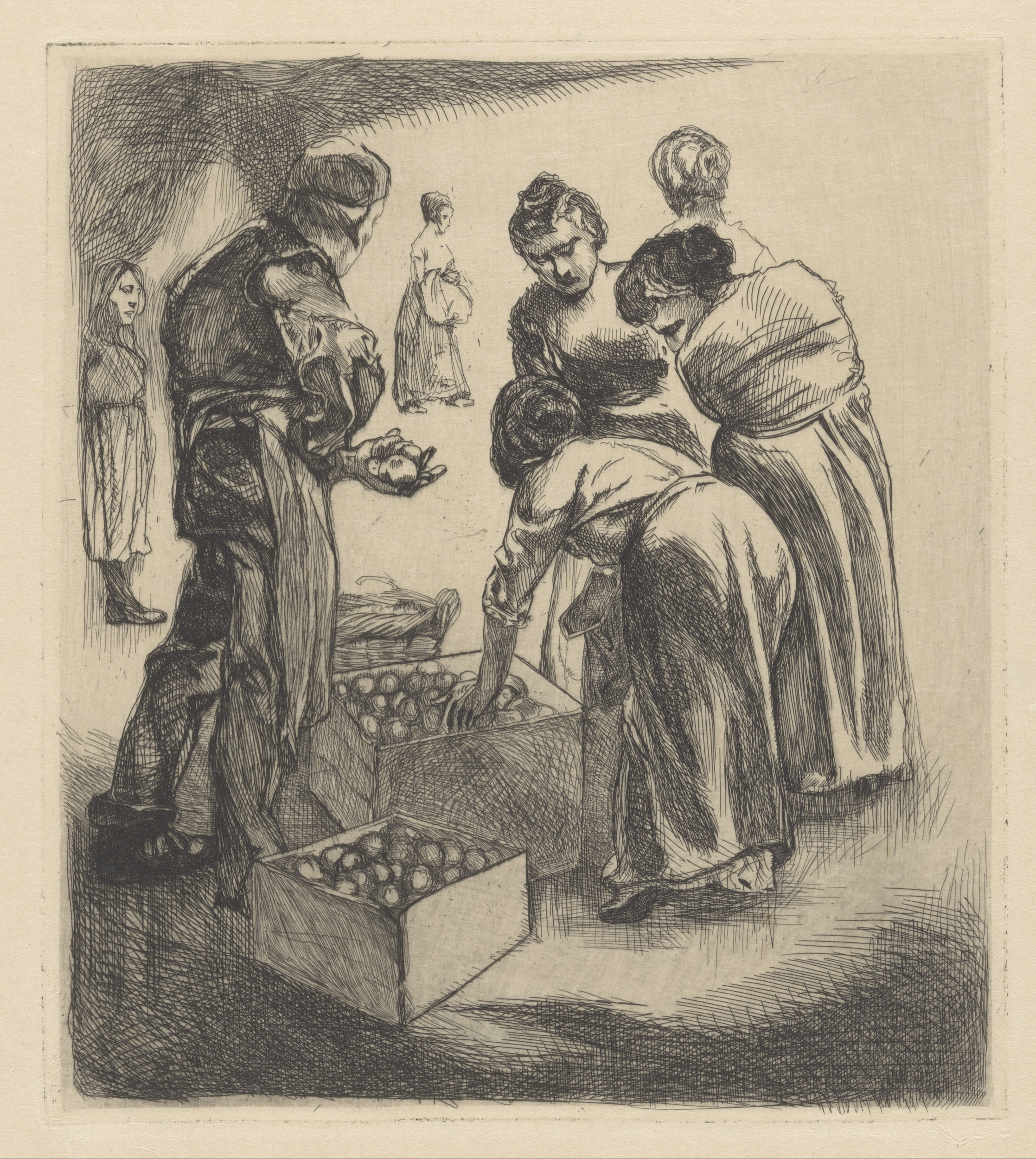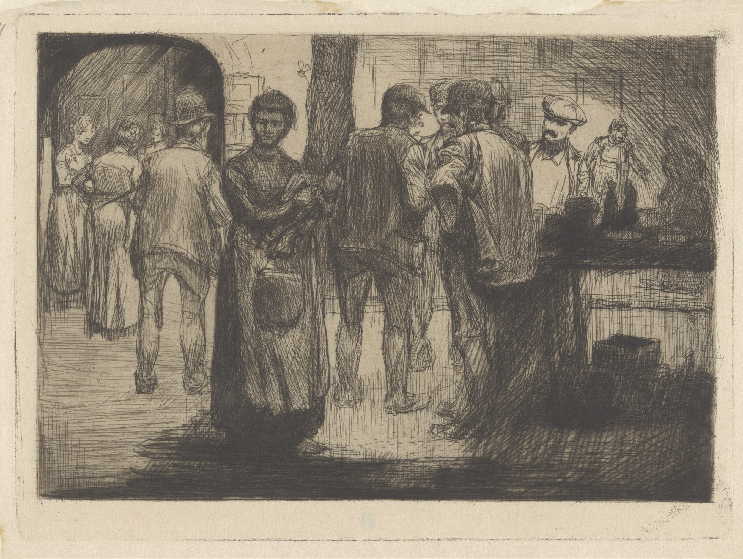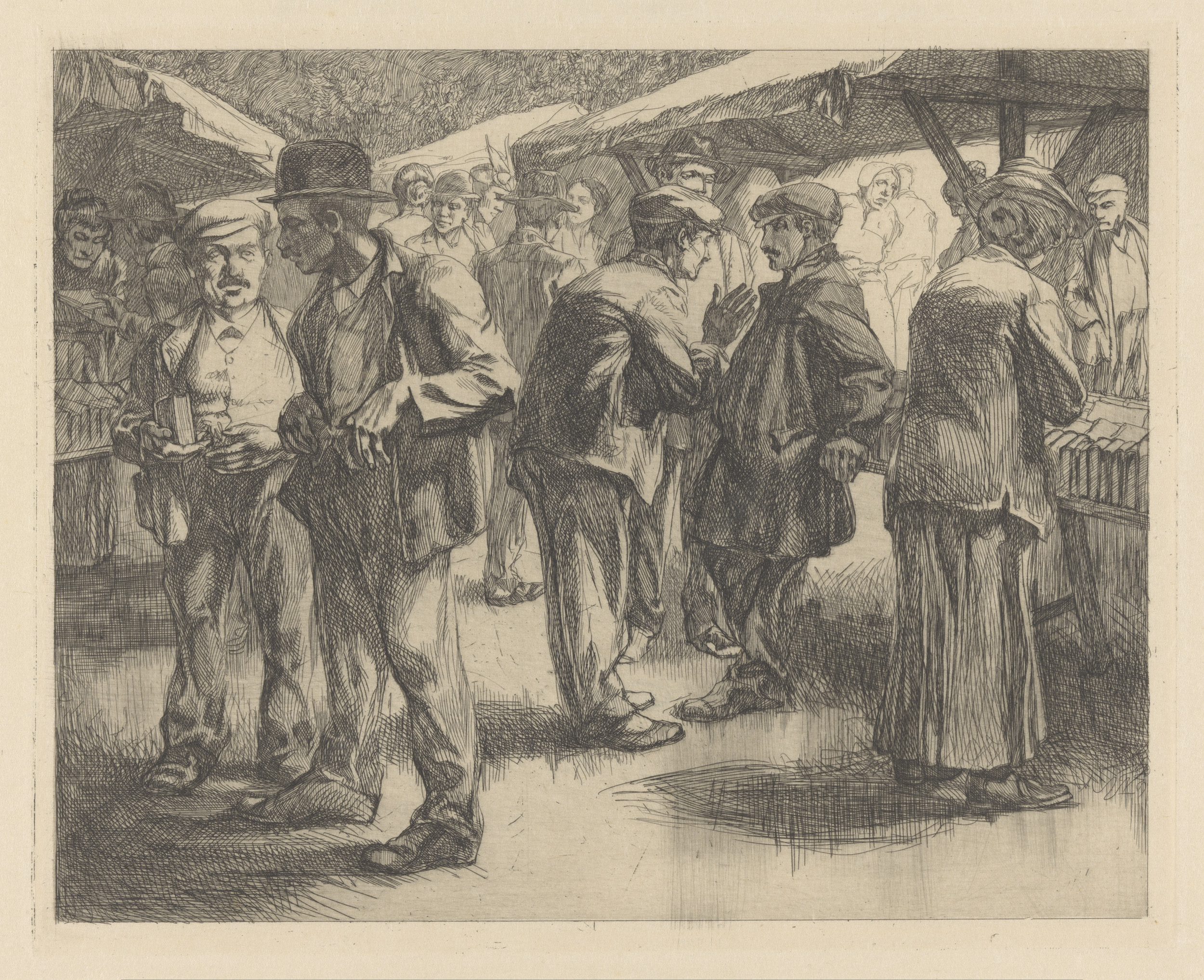 Marktscène met mannen en vrouwen