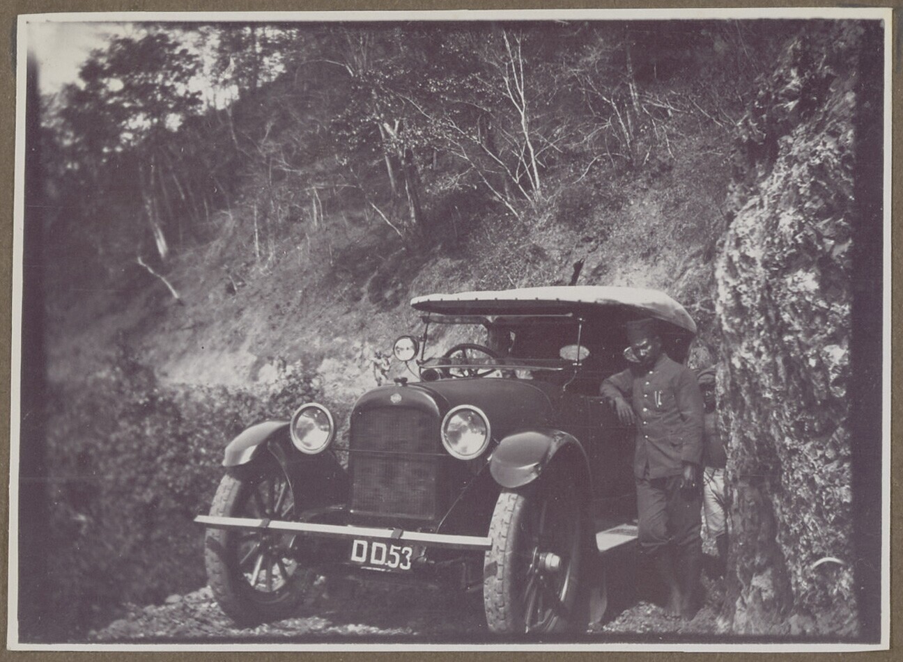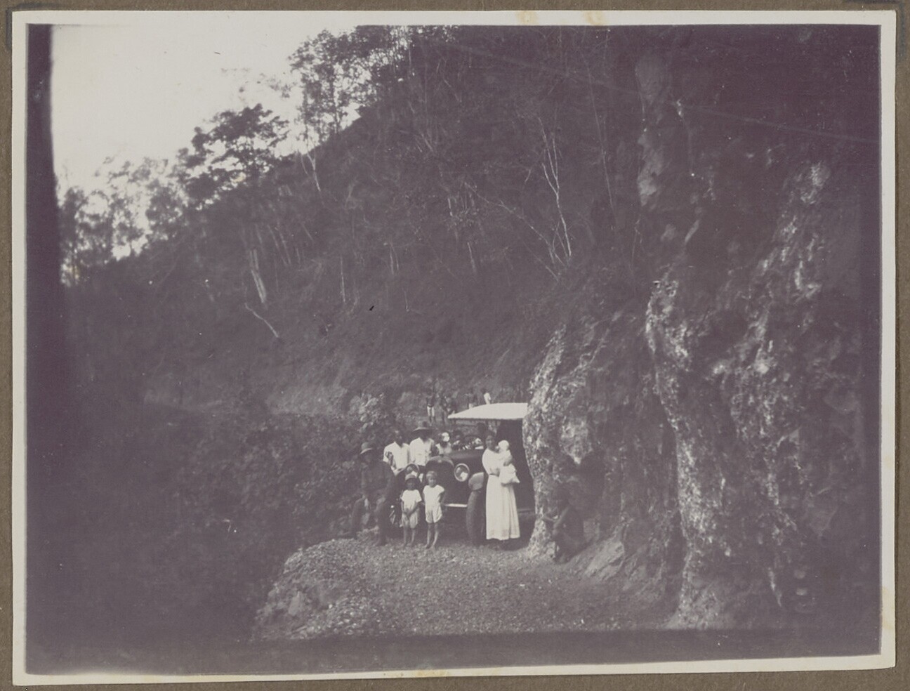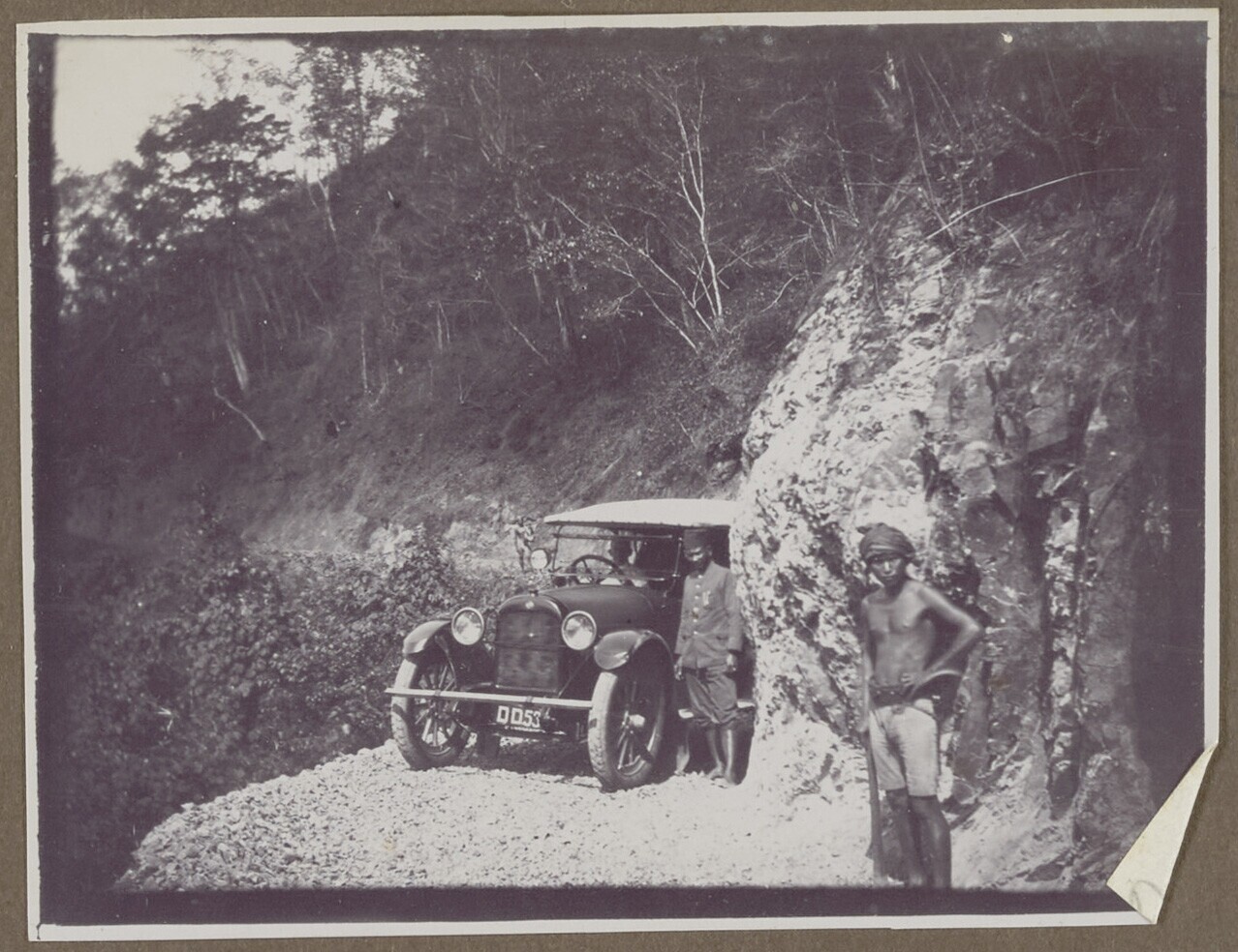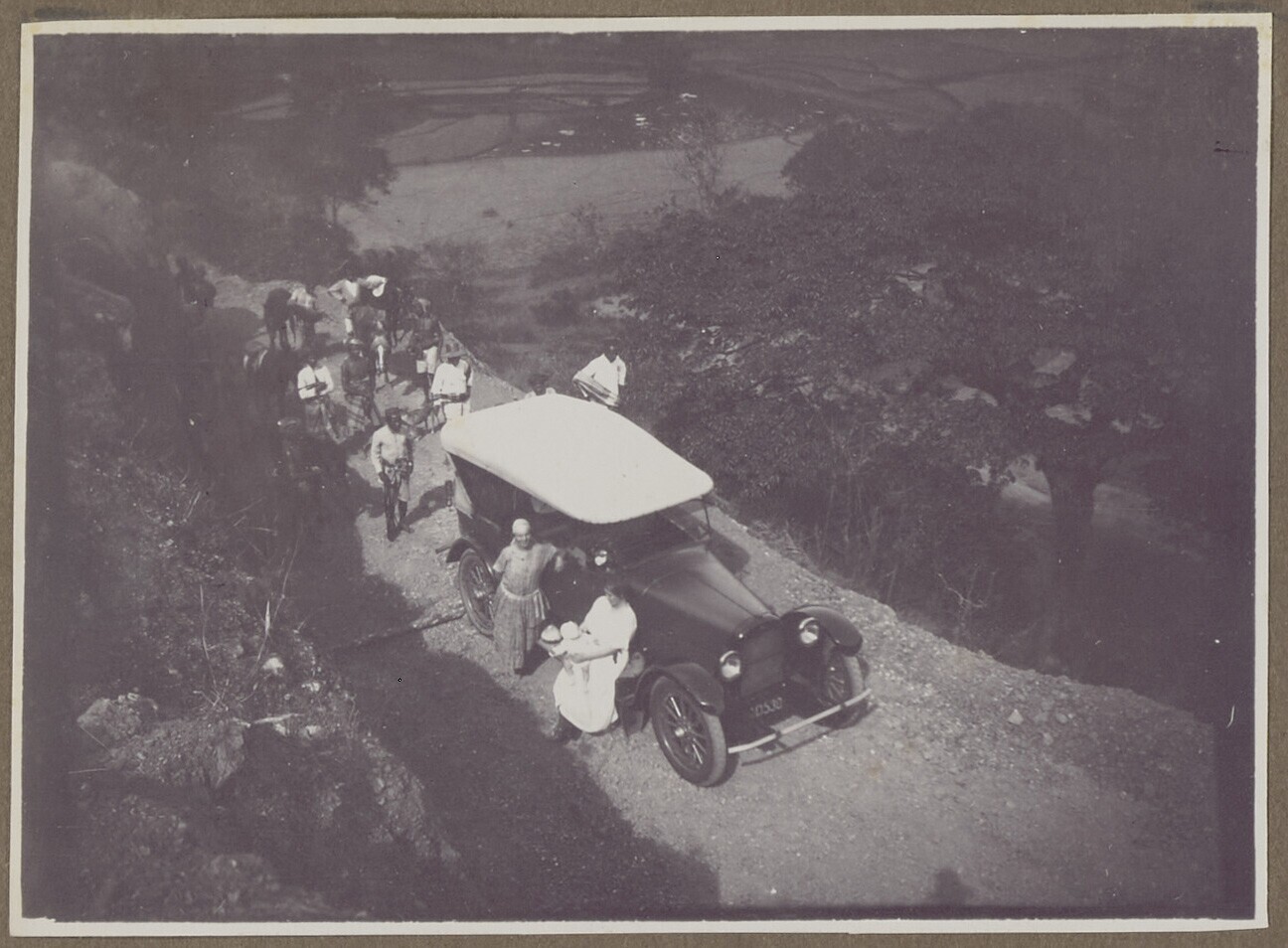 Mensen rondom een auto op een smalle bergpas