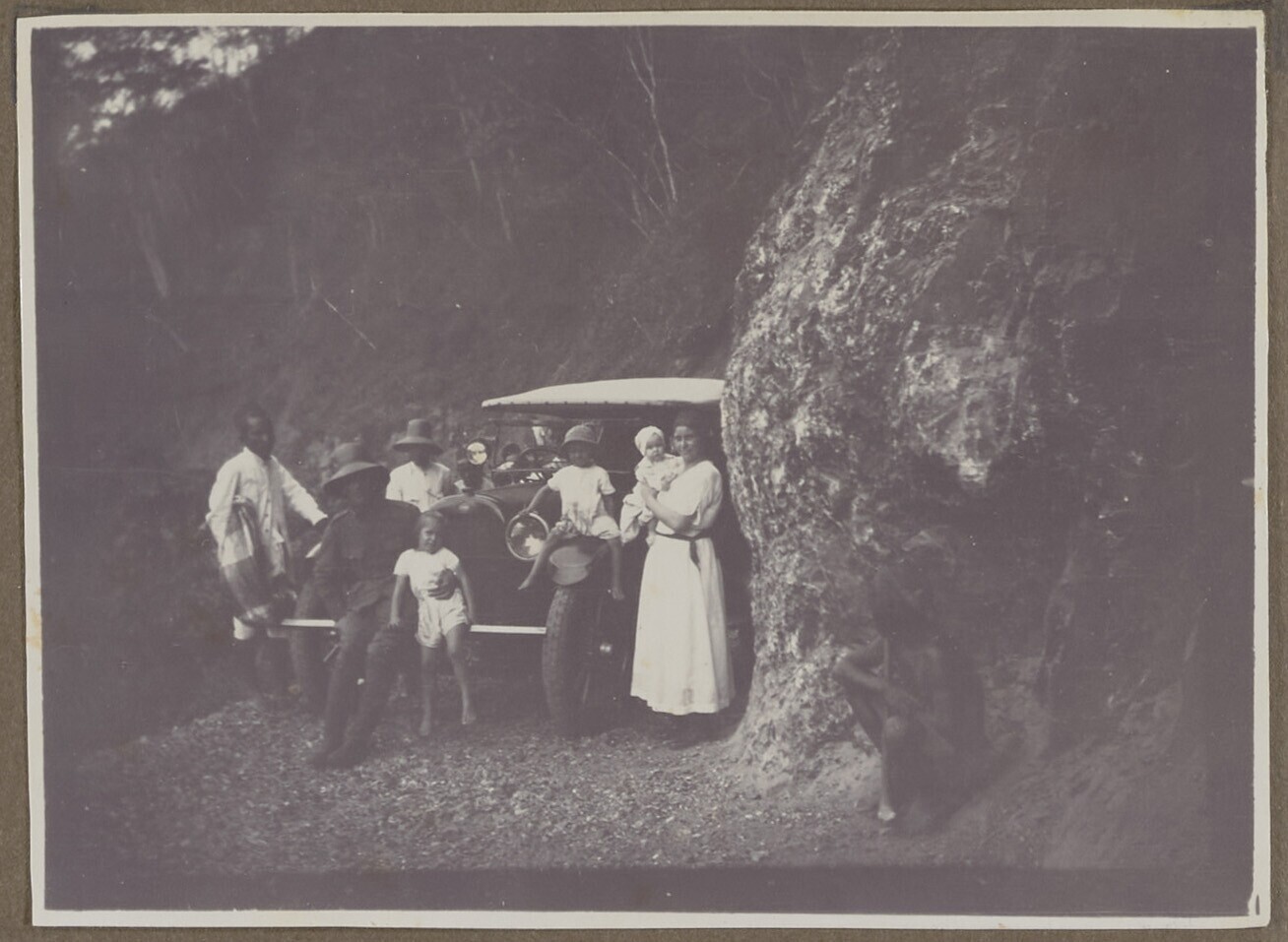 Mensen rondom een auto op een bergweg