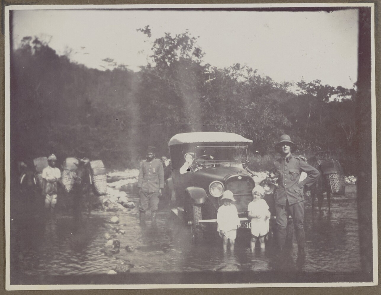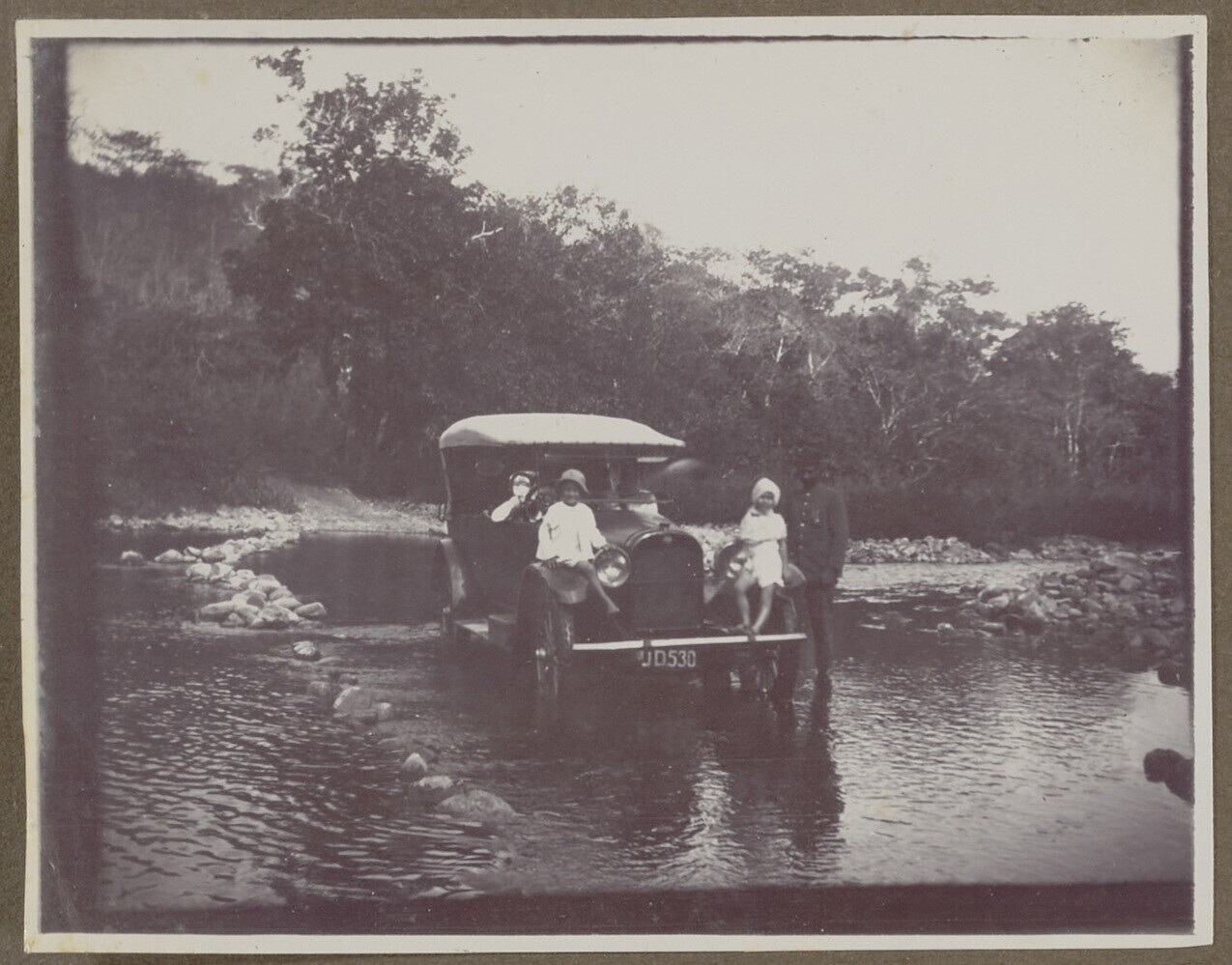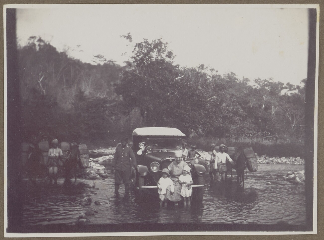 Een groep kinderen op een auto in een rivierbedding