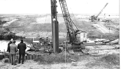 Werkzaamheden aan een dijk, mogelijk de Oostvaarders...