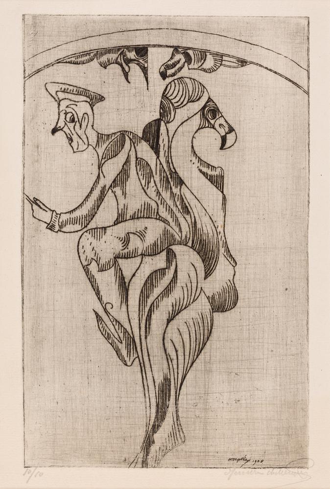 Fantasie: matroosachtige en vogel, ruggelings geplaatst