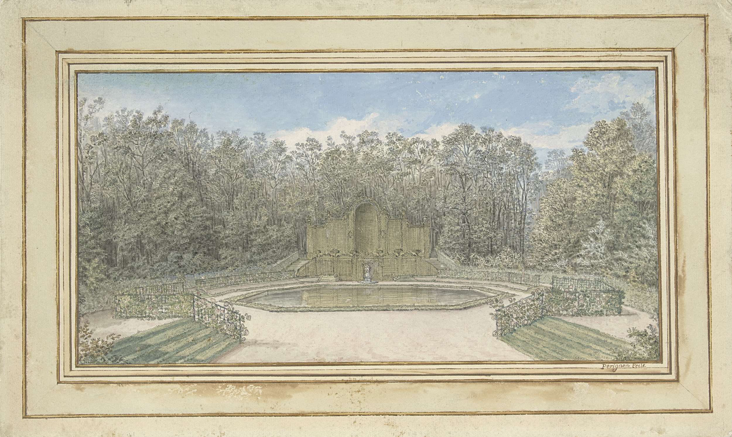 Gezicht op een prieel van latwerk in een park