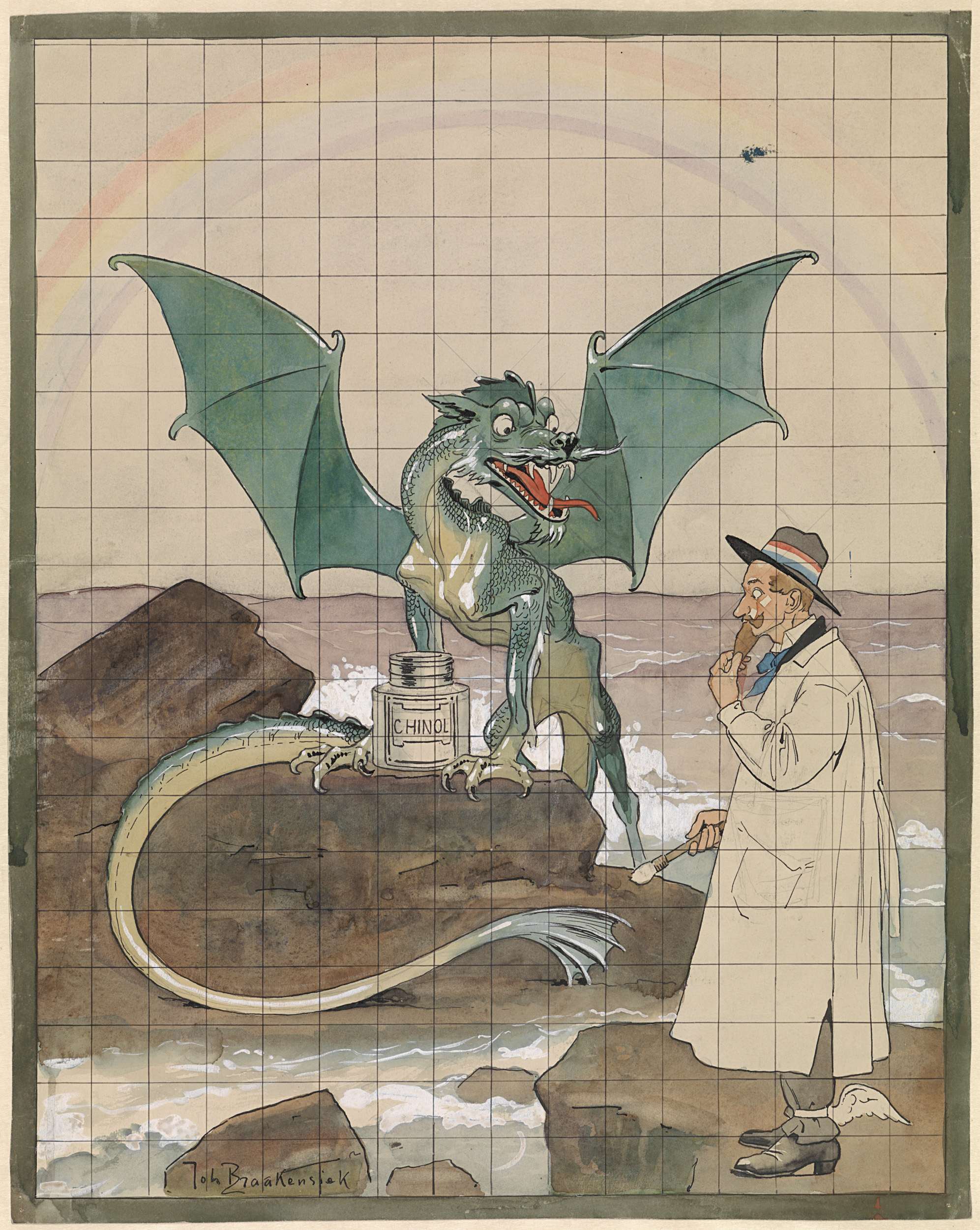 Kunstenaar met draak bij een pot Chinol