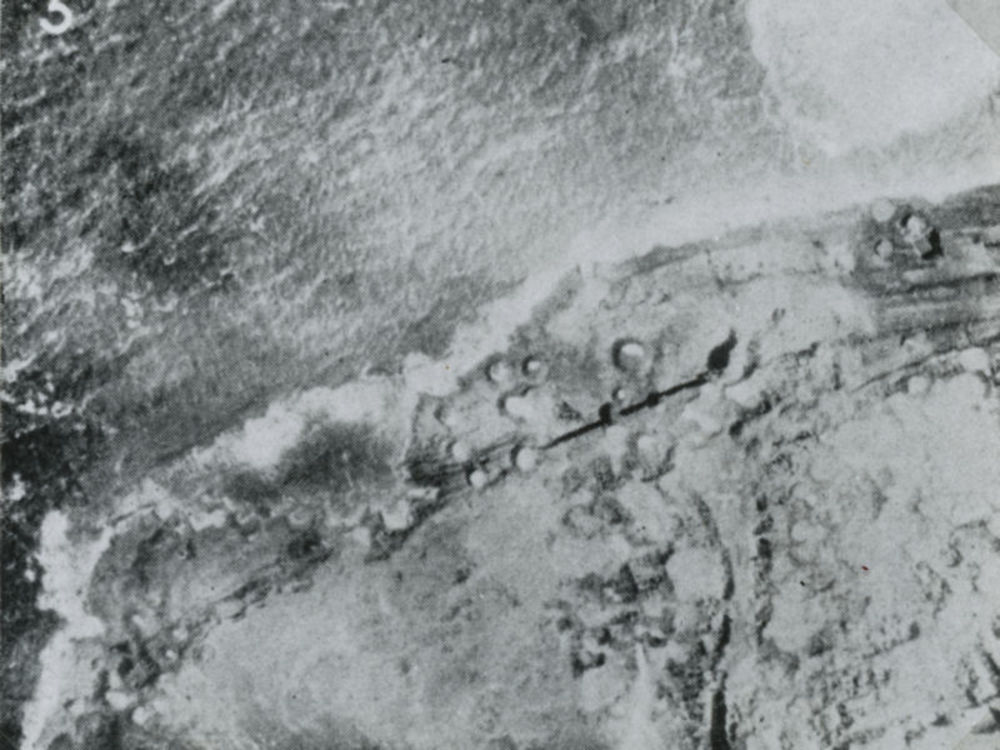 Luchtfoto van kapotgebombardeerde dijk bij Westkapelle.