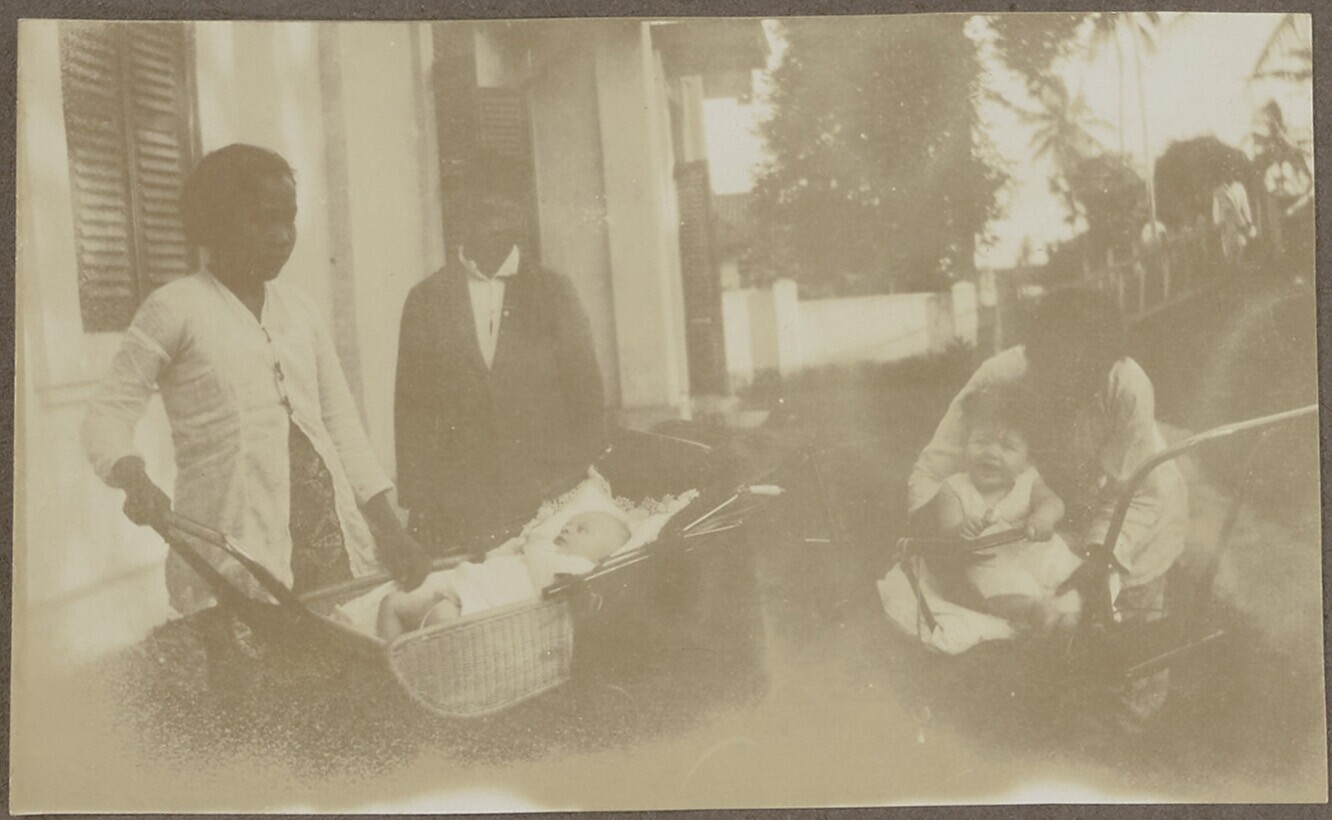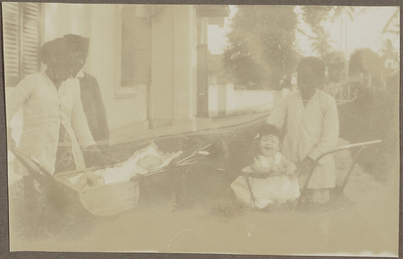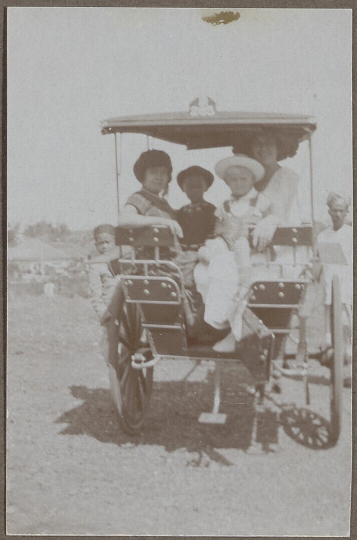 Portret van twee vrouwen en kinderen in een rijtuig ...