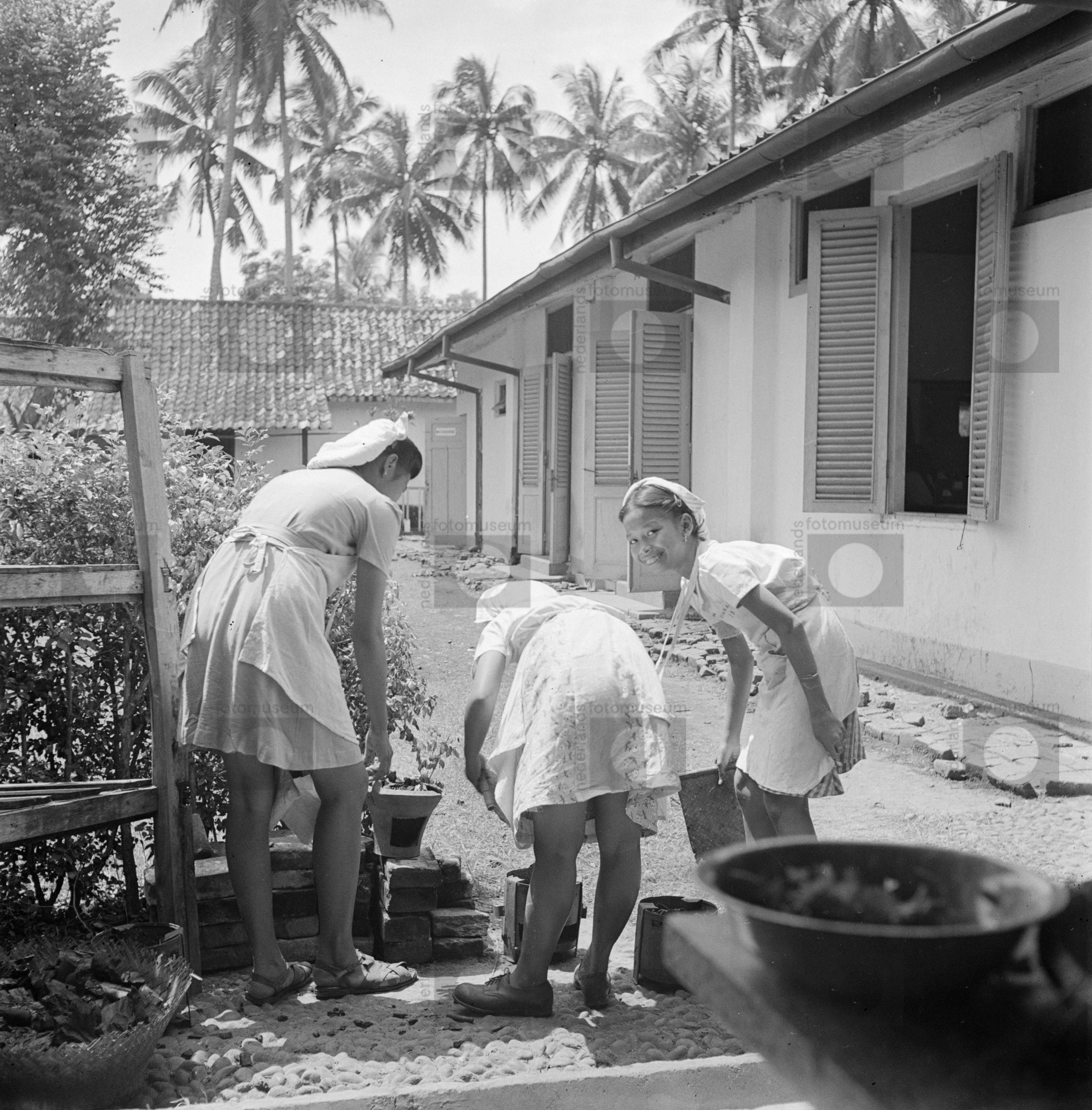 Meisjes krijgen kookles in een huishoudschool te Jak...