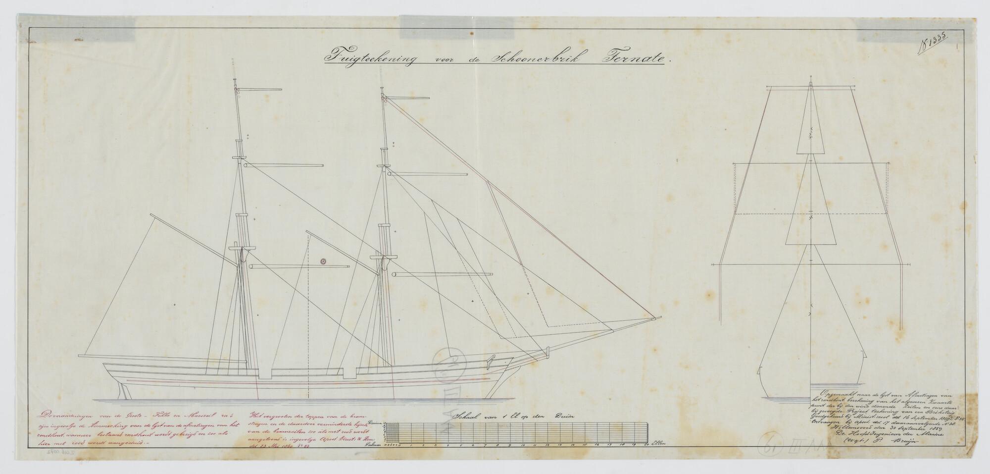Tuigplan van de schoenerbrik Zr.Ms. Ternate, 1841