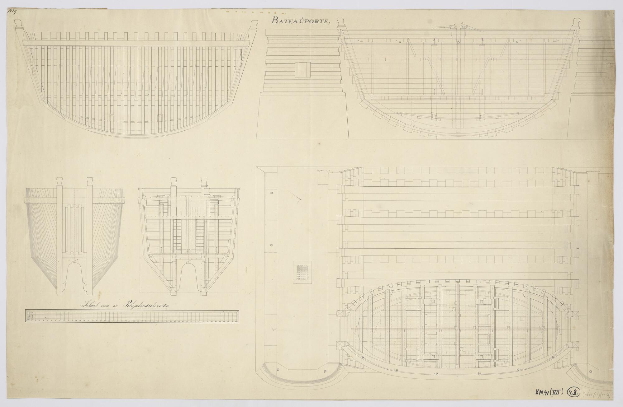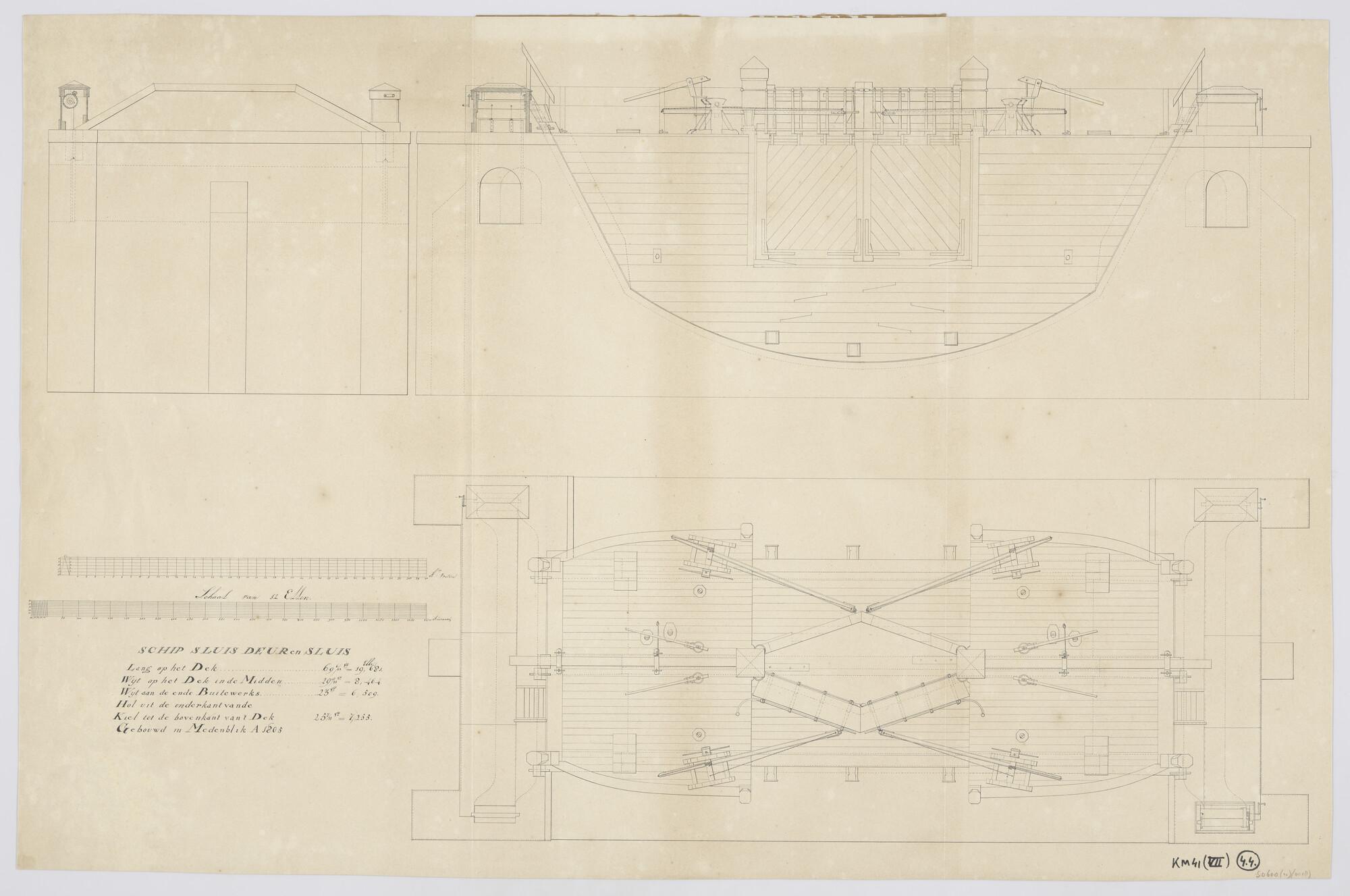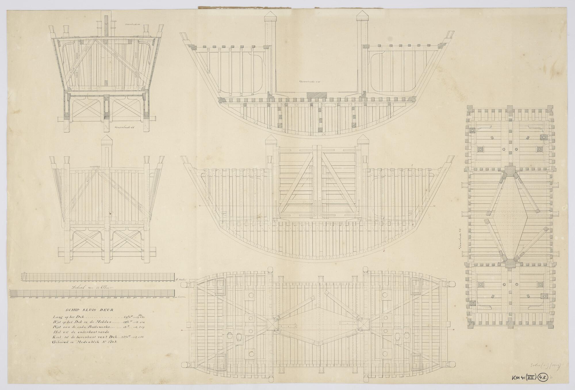 Doorsneden en bovenaanzicht van een schipdeur (batea...