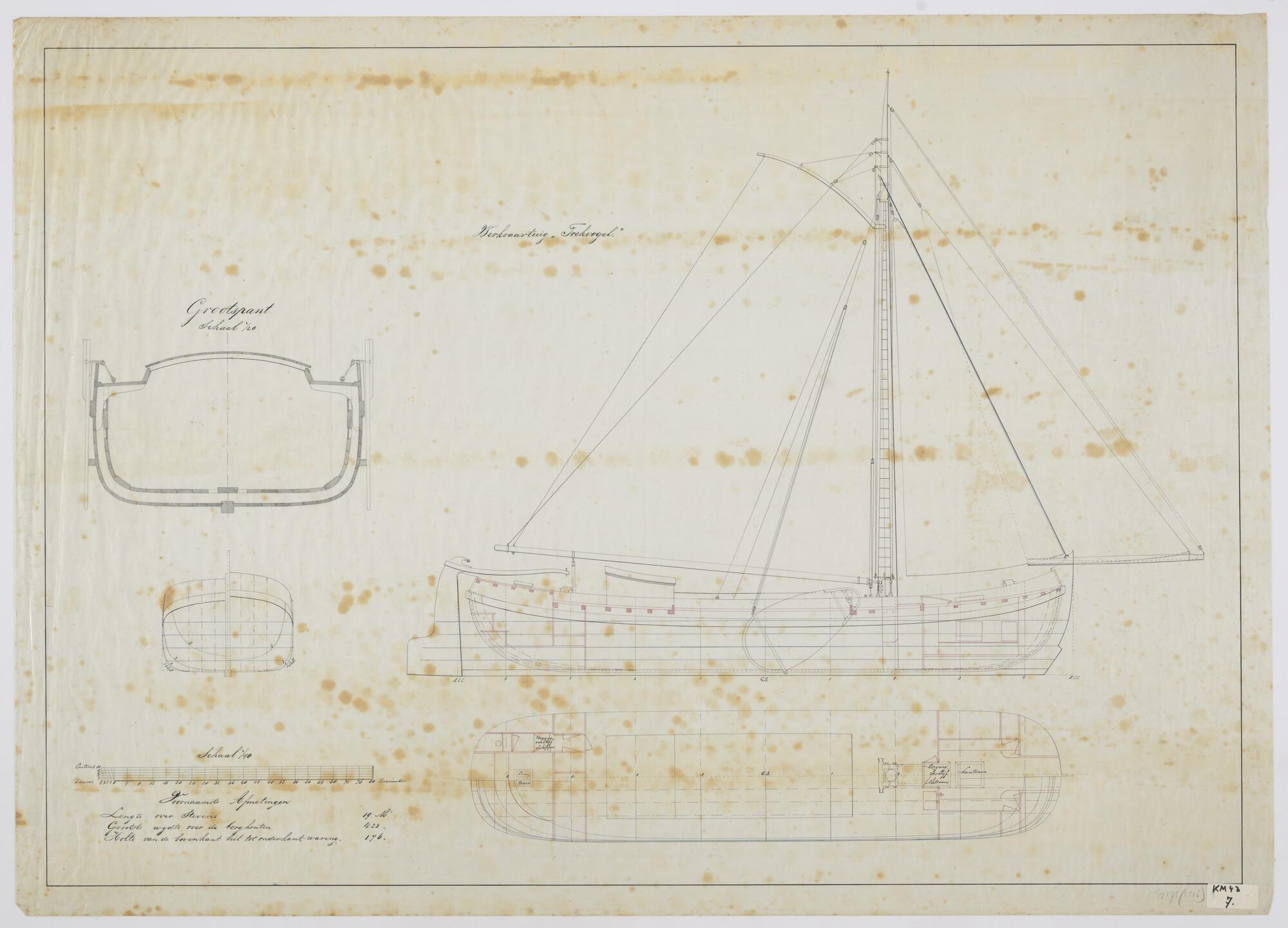 Zijaanzicht, lijnenplan, spantenraam en grootspant v...