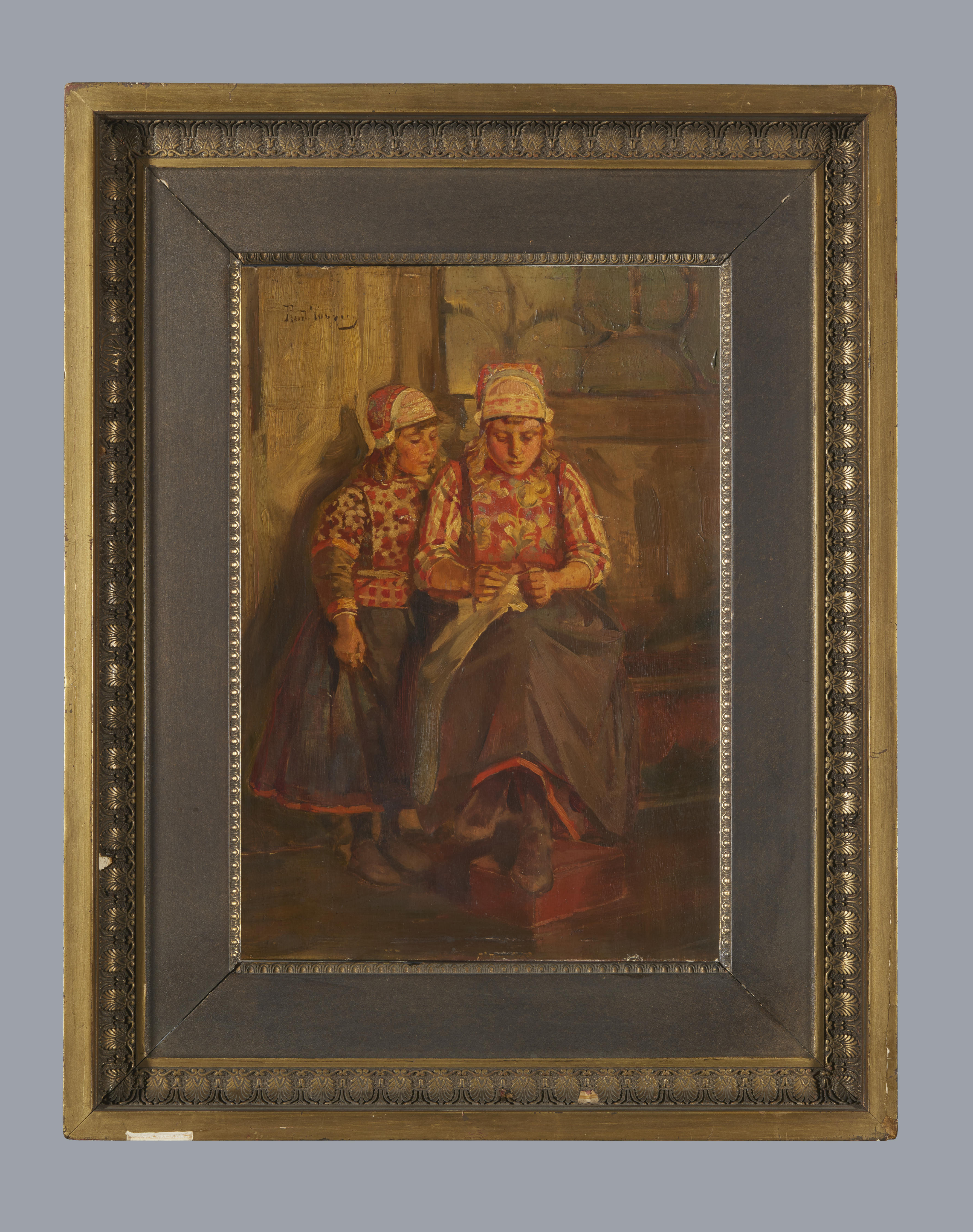 Handwerkende meisjes in interieur, Marken, circa 1920