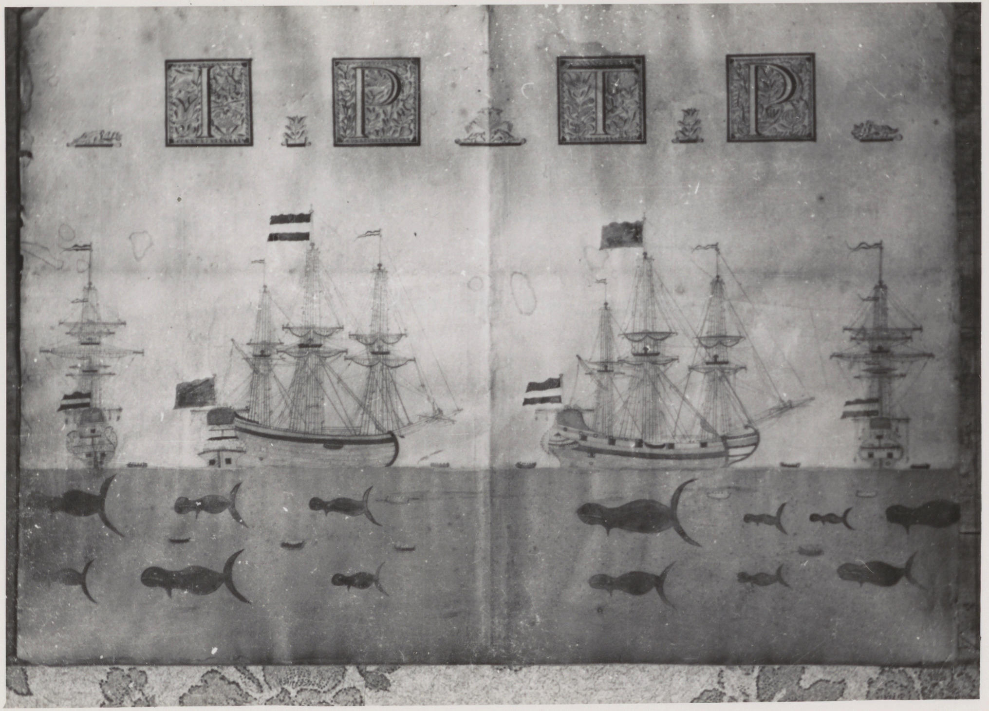 Aquarel van walvisvaart, Marken, 1943 (zwart-wit foto)