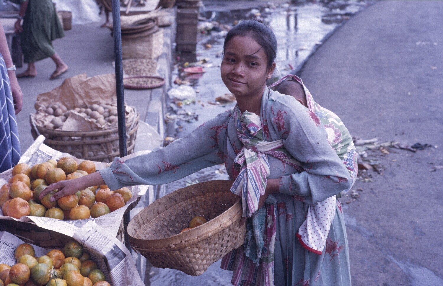 Sinasappels kopende vrouw met een kind in draagdoek ...