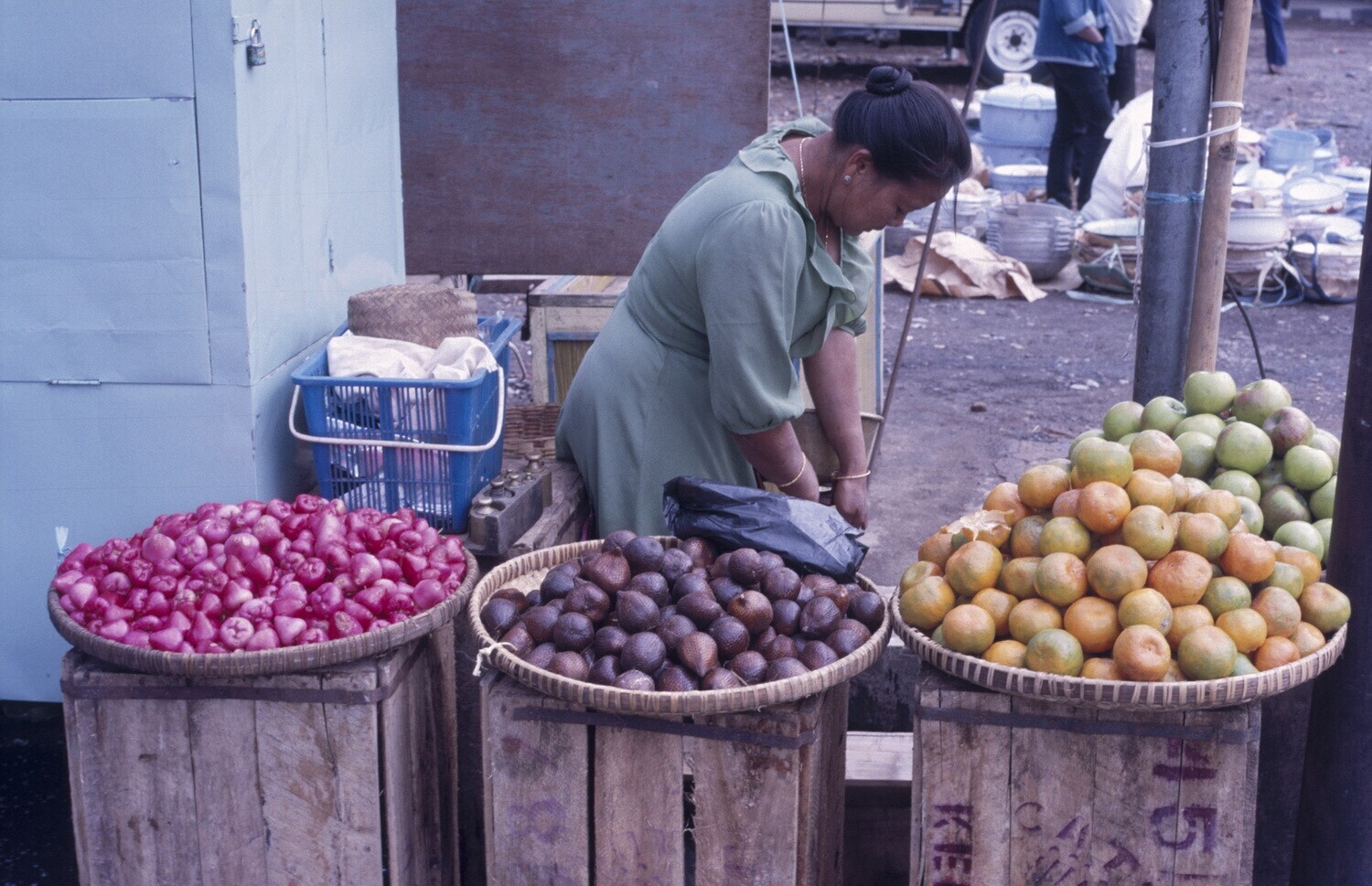 Een fruitverkoopster. Van links naar rechts: djamboe...