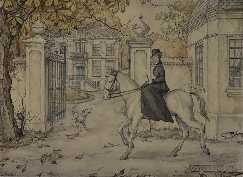 Paardrijdende dame, kalenderplaat Amazone op schimmel