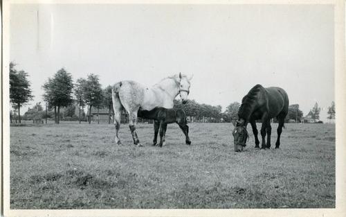 Foto in zwart-wit van twee paarden en een veulen