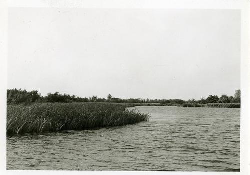 Foto in zwart-wit van een breed water met rietkraag