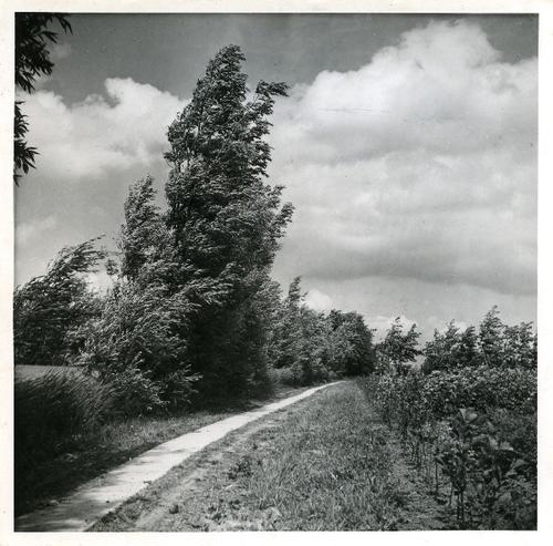 Foto in zwart-wit van bomen in de wind langs een fie...