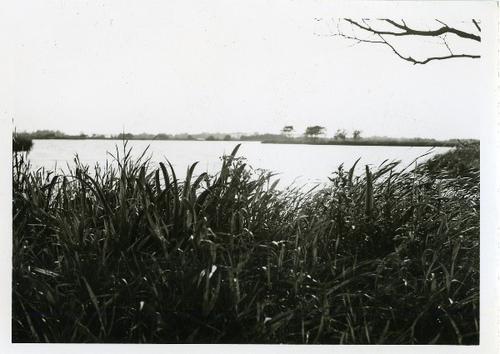 Foto in zwart-wit van een meer met oeverbegroeiing