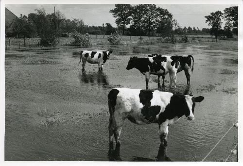 Foto in zwart-wit van pinken in een ondergelopen wei...